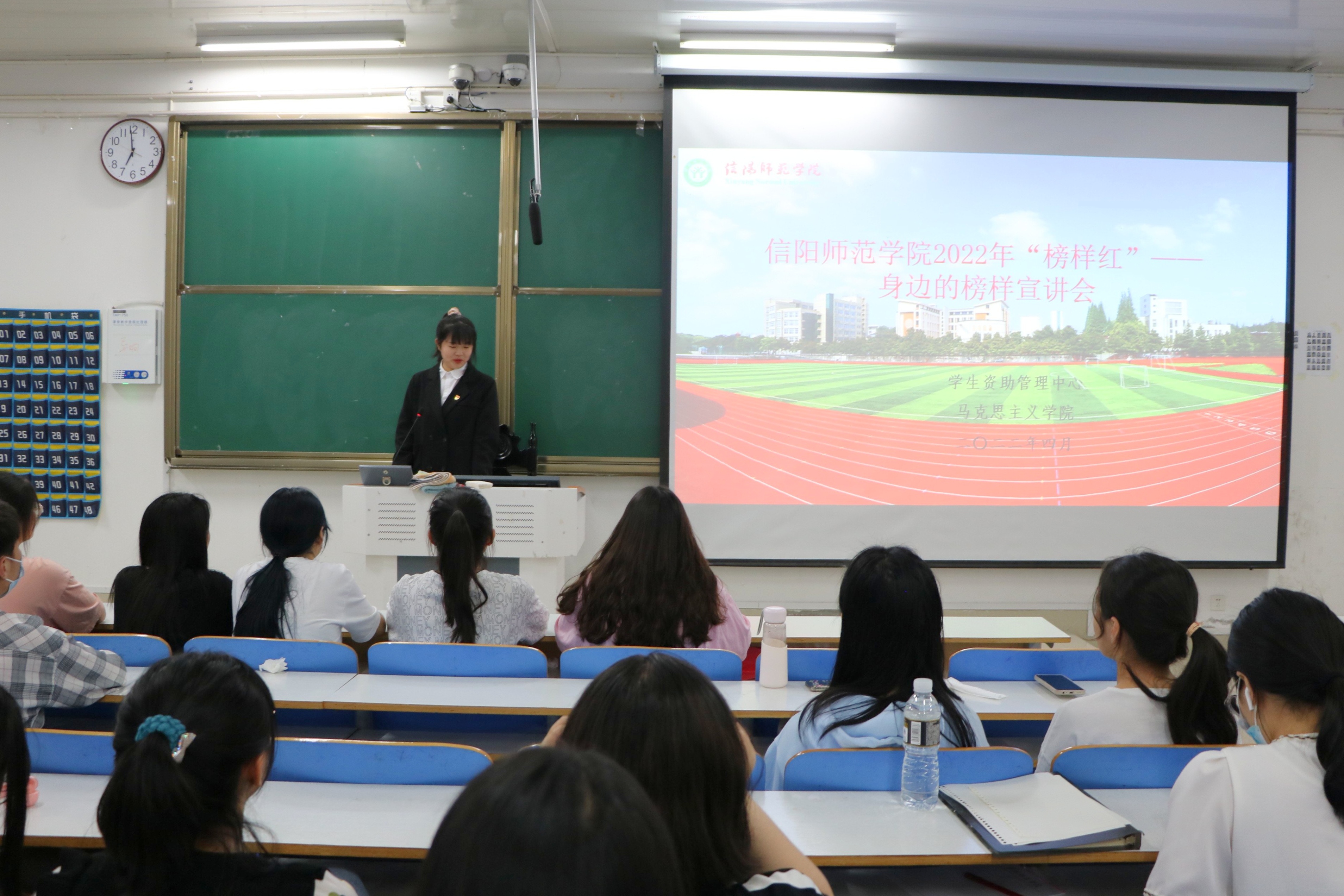 4月26日晚,2026年世界杯官网在社科楼516教室开展“身边的榜样”宣讲活动。宣讲人地理科学学院国家奖学金获得者刘翌晨、计算机与信息技术学院校园明星程晓龙、体育学院自强之星薛杨杨和2021级部分同学共同参加此次宣讲活动,活动由权益保障部负责人宋佳怡主持。