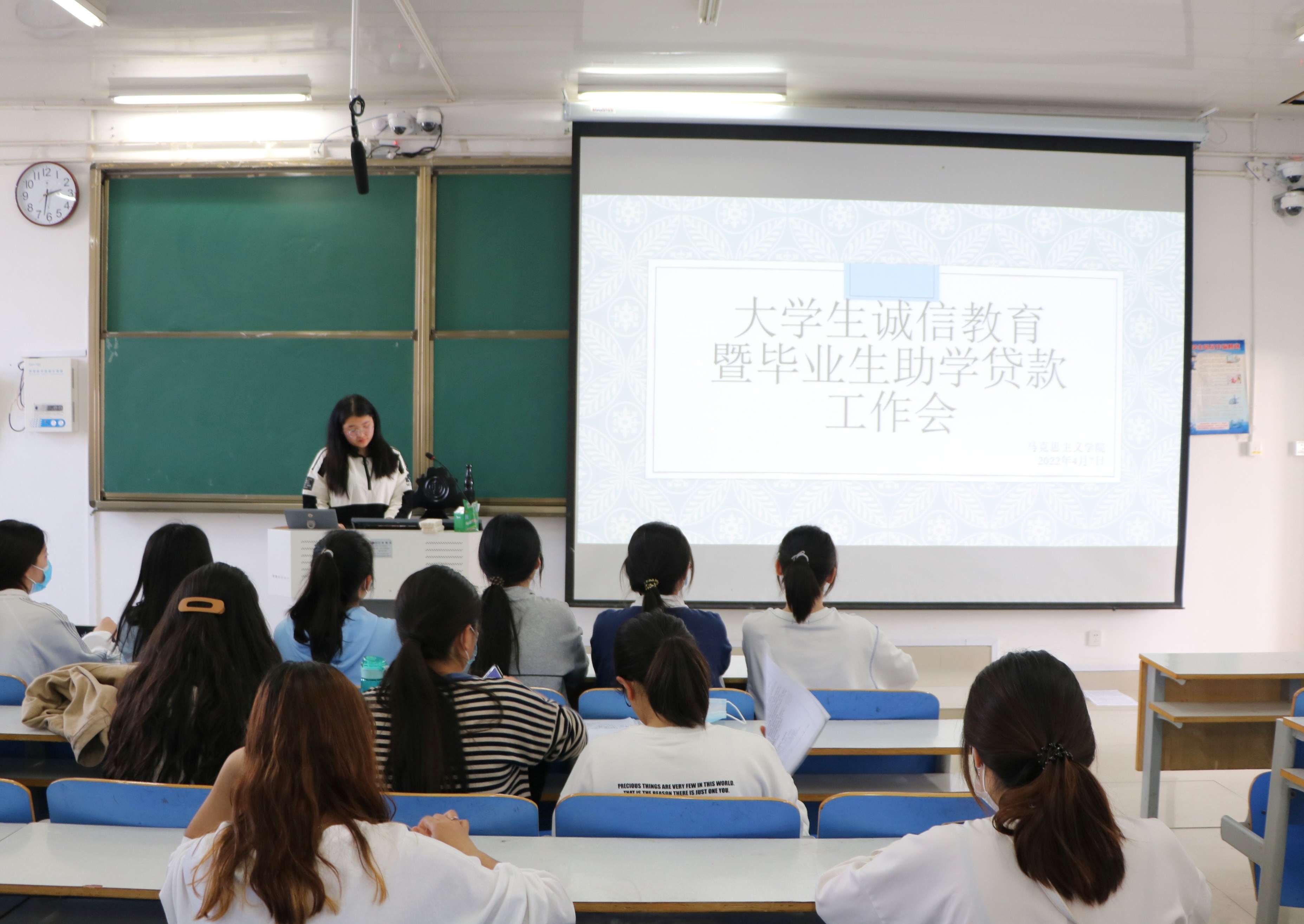 会议伊始,宋佳怡就会议主题“老员工诚信贷款”展开论述,她重点讲述了老员工助学贷款违约的后果以及违约的处理措施,并说明未按时还款将对个人信用形成负面记录,对自身发展产生不利影响,强调老员工应以诚信为第一美德,做到按时还款,不失约违约,坚决遵守贷款合约规定。随后,她为同学们介绍了还款流程,详细讲解了还款时间、还款方式及其他相关事项,并且提醒注意查询还款时间,按照还款流程及时还款。最后,她对国家的助学贷款政策做了进一步的补充说明,其中包括贷款申请条件、申请时间、发放时间等,帮助各位同学对国家贷款资助政策有了更深的了解。