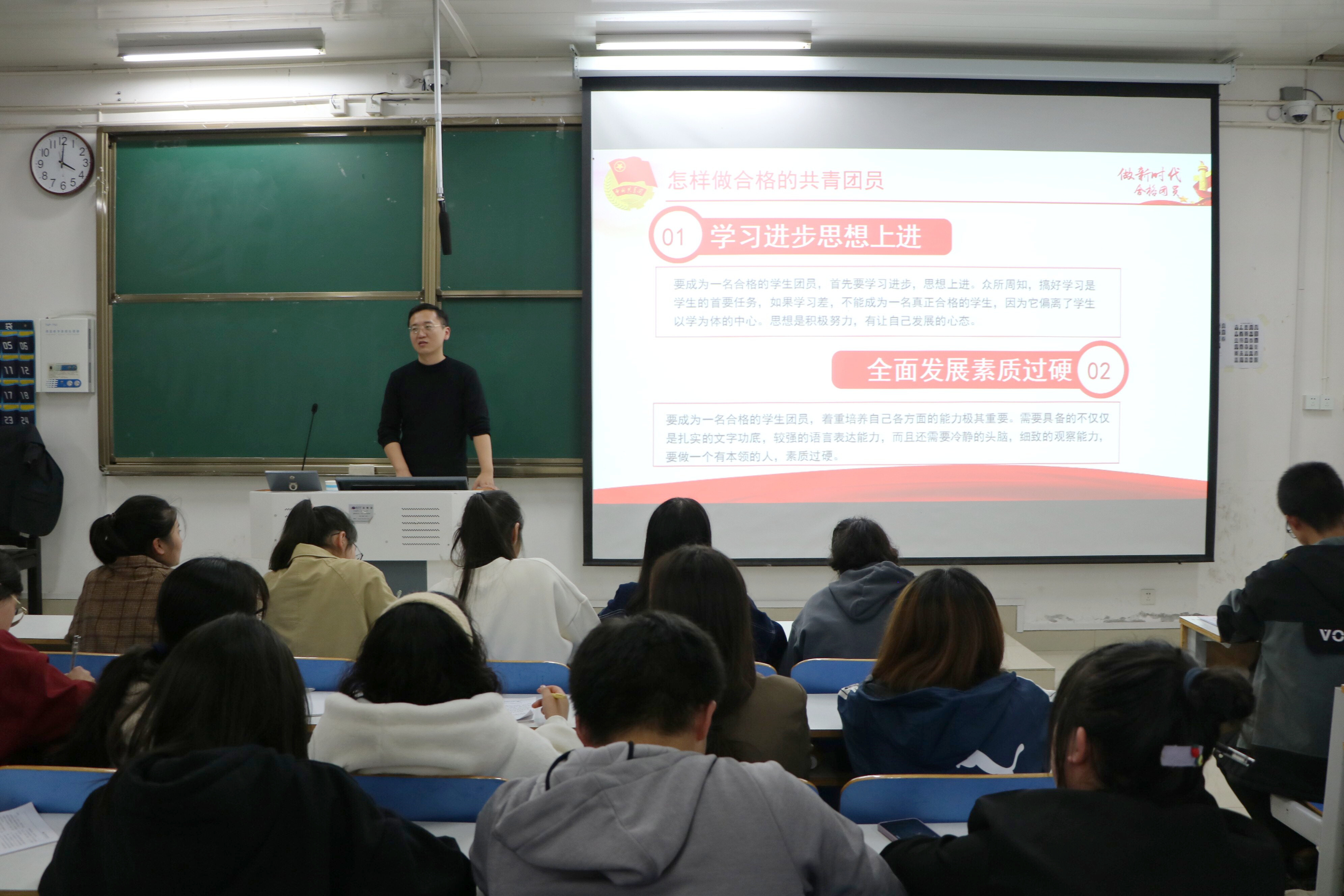 首先,曹栋以习近平总书记对新时期青年一代的叮嘱为导语,指出新时代共产主义青年团是引领青年承担使命、接力奋斗的重要组织。他讲述自身对中国共产党和共产主义青年团的认识,强调新生团员应自觉研习党史,学习团章、做好党的助手与后备军,牢记“党旗所指,团旗所向”的重要指示,在成长中贯彻落实党的方针政策。随后,曹栋结合习近平总书记“七一”重要讲话提出,共青团员应传承伟大建党精神,具备坚定的共产主义理想和信念、要有优秀的品质和道德、要有品学兼优的素质和扎实的文化基础,并向新生团员们讲解了“三会两制一课”的主要内容。最后,曹栋亲切叮嘱新生团员们要在学习生活中学党史,强信念,肩负团员使命,积极参加学院、班级组织的各项活动,锻炼自我、提升自我、成就自我,在实干中增长本领,在点滴小事中积累经验。