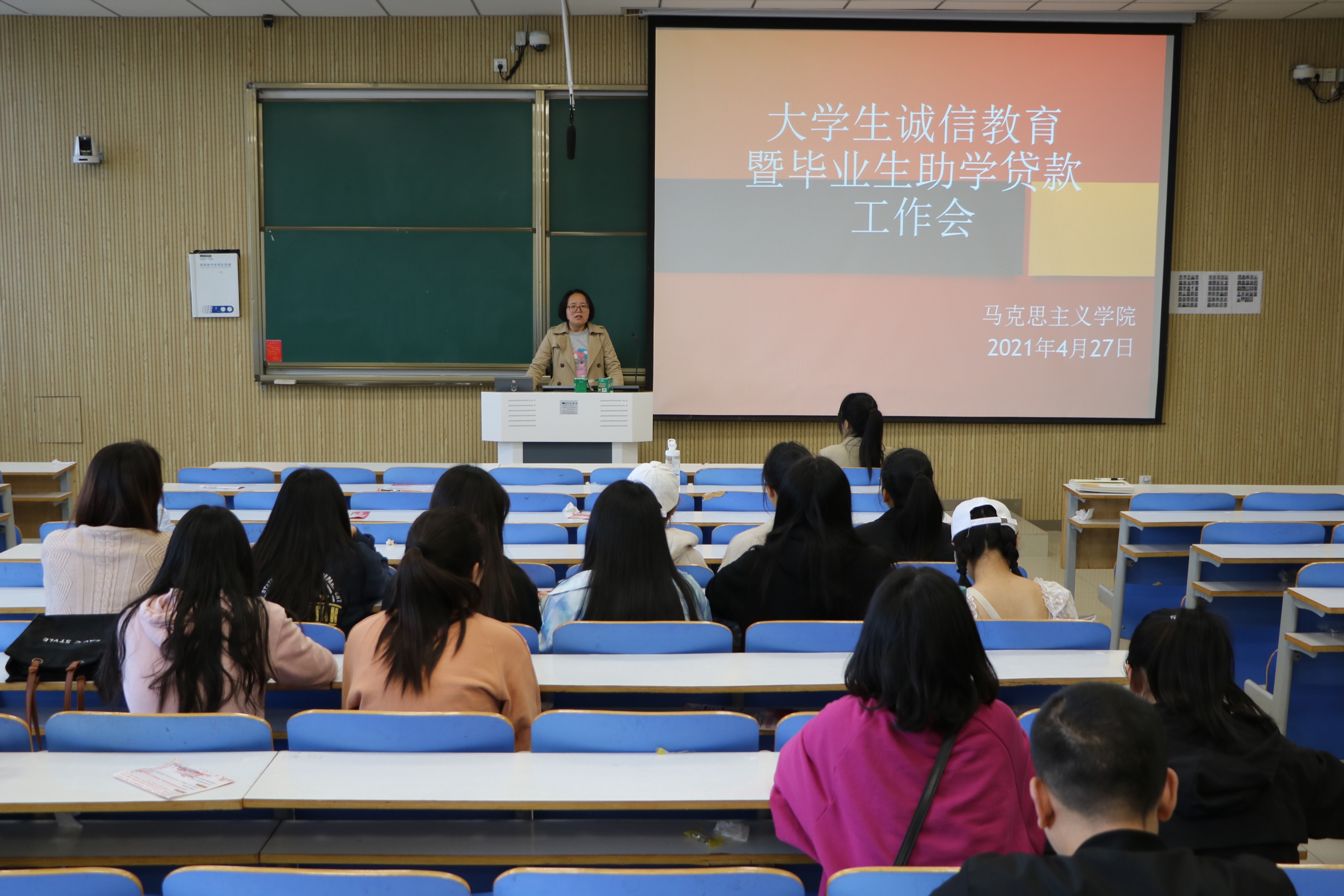 曹菁菁首先从国家助学贷款业务概述、违约后果、违约处理措施、还款还息办法等方面为应届毕业生进行了详细的介绍。她指出,同学们可以通过支付宝和POS机两种支付渠道进行还款。接着,她以诚信为话题,通过列举真实案例,强调贷款违约的严重后果,希望同学们引以为戒,树立诚信观念,按时还款还息,保持良好的信用记录,为个人积累信誉财富。曹菁菁还通过PPT向同学们展示了如何科学地建立还款计划,为日后还款做准备。接着,曹菁菁向毕业生详细安排毕业确认、信息核对与采集以及其他相关工作。最后,曹菁菁与同学们面对面交流,针对同学们提出的相关疑问进行认真解答。