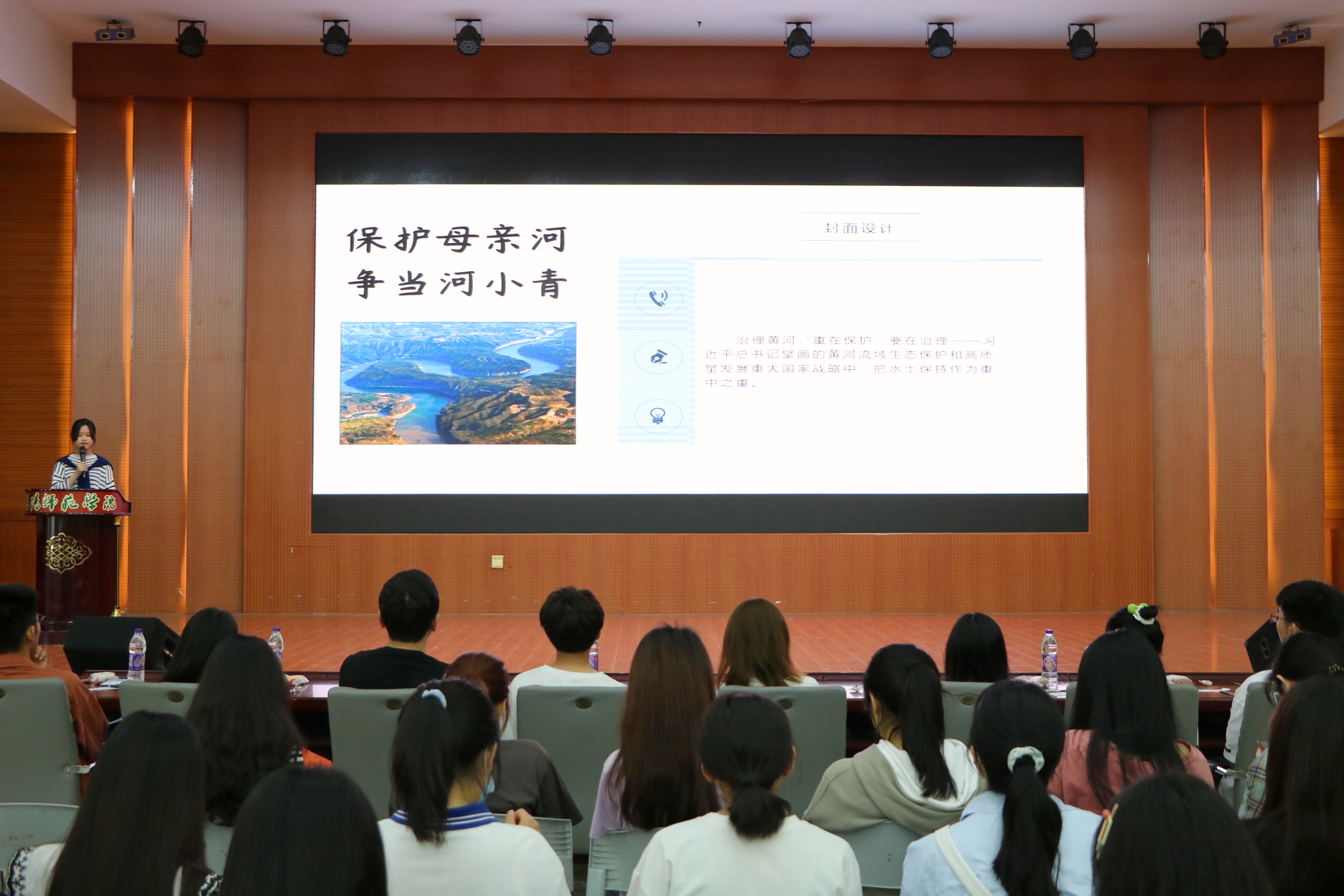 活力四射的开场舞点燃现场观众的热情,拉开活动帷幕。共有八组选手从初赛中脱颖而出进入决赛,各小组紧扣活动主题,从海报设计理念,宣传册内容等多方面进行宣讲。其中,第三组主讲人王曼垚以“保护母亲河,争当河小青”为题,结合黄河九曲第一弯、壶口瀑布的生态环境现状,利用诗词和习语,呼吁同学们保护黄河生态环境。作品设计新颖,紧扣主题,令人耳目一新。第七组主讲人韩笑从青少年角度出发,详细讲述了海报的设计理念,分析了黄河水资源现状,并提出了有效的保护措施。宣讲形式新颖,现实意义深刻。最后,通过观众和评委投票,共同选出获奖作品。比赛期间穿插诗朗诵、歌舞表演和抽奖环节,增添了活动的趣味性,提高观众的参与度。