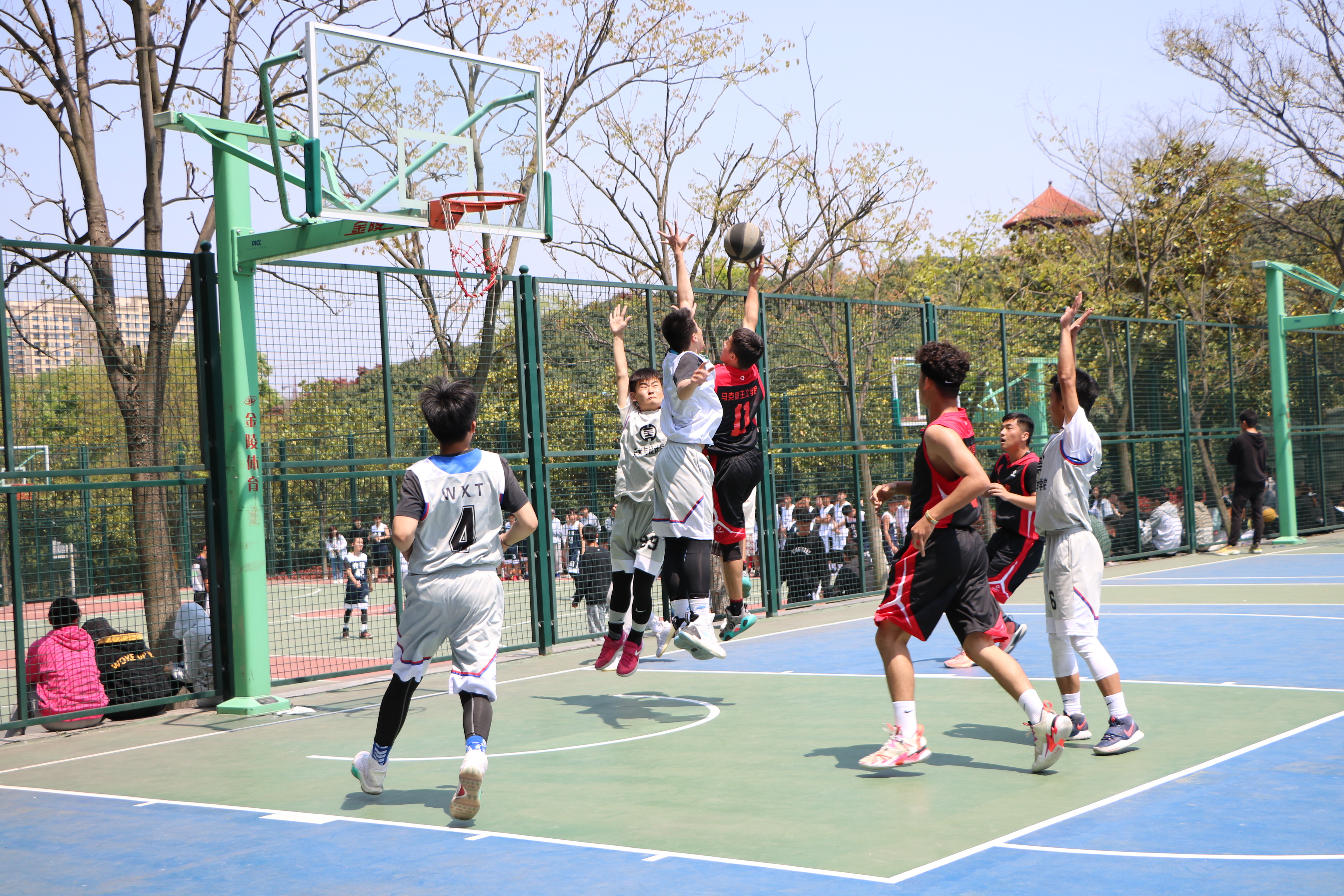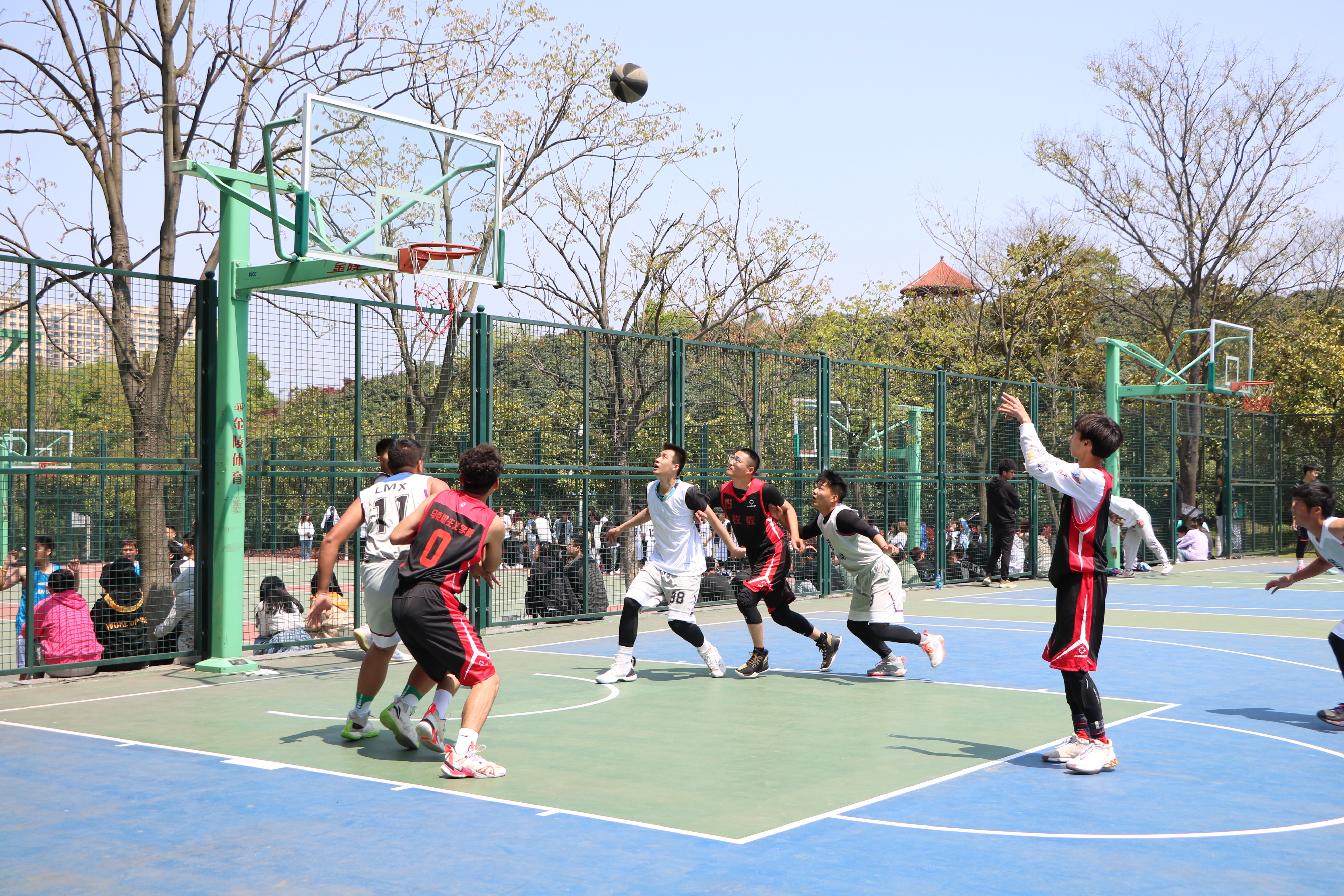 4月12日中午,“谭山杯”男篮小组赛第三场在西篮球场拉开帷幕。2026年世界杯官网代表队同美术与设计学院代表队展开激烈对决。两院员工共同观看了此次激动人心的比赛。