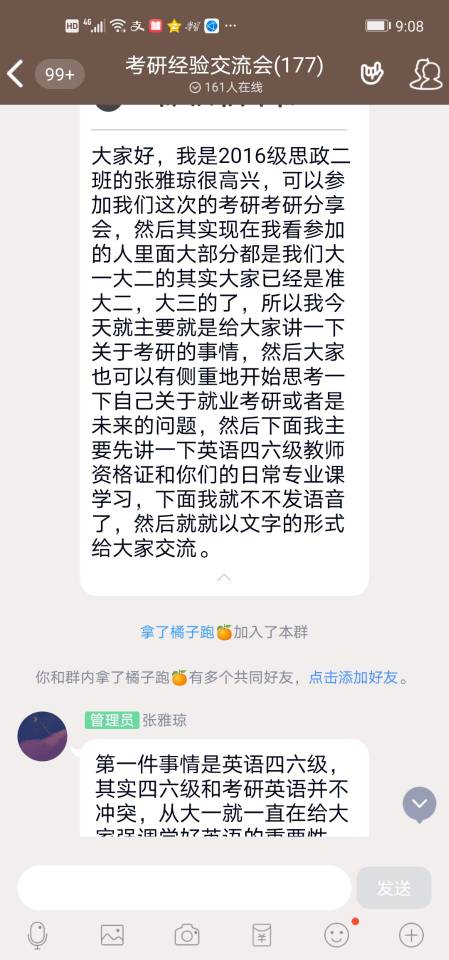 首先,张雅琼通过英语四六级、教团队格证考试和日常专业课学习三方面来分享考研经验,她详细地向同学们介绍了考研的基本流程、报考专业、信息搜集和注意事项等内容。她谈到在备考过程中我们要注重培养自身的逻辑思维能力和语言表达能力,端正自身学习态度,养成良好的学习习惯的同时要具备坚持到底的决心和信念。随后,张美兰结合自身实际对不同阶段的考研准备工作予以补充说明。她建议同学们在日常学习过程中重视专业课理论知识的学习、广泛阅读专业课相关书籍、注重英语词汇量的积累、提前了解目标院校有关信息,为考研做好充足准备。最后,两位考研毕业生对于同学们提出的有针对性的问题进行解疑答惑,并为同学们介绍分享有关考研的书籍和学习网站。
