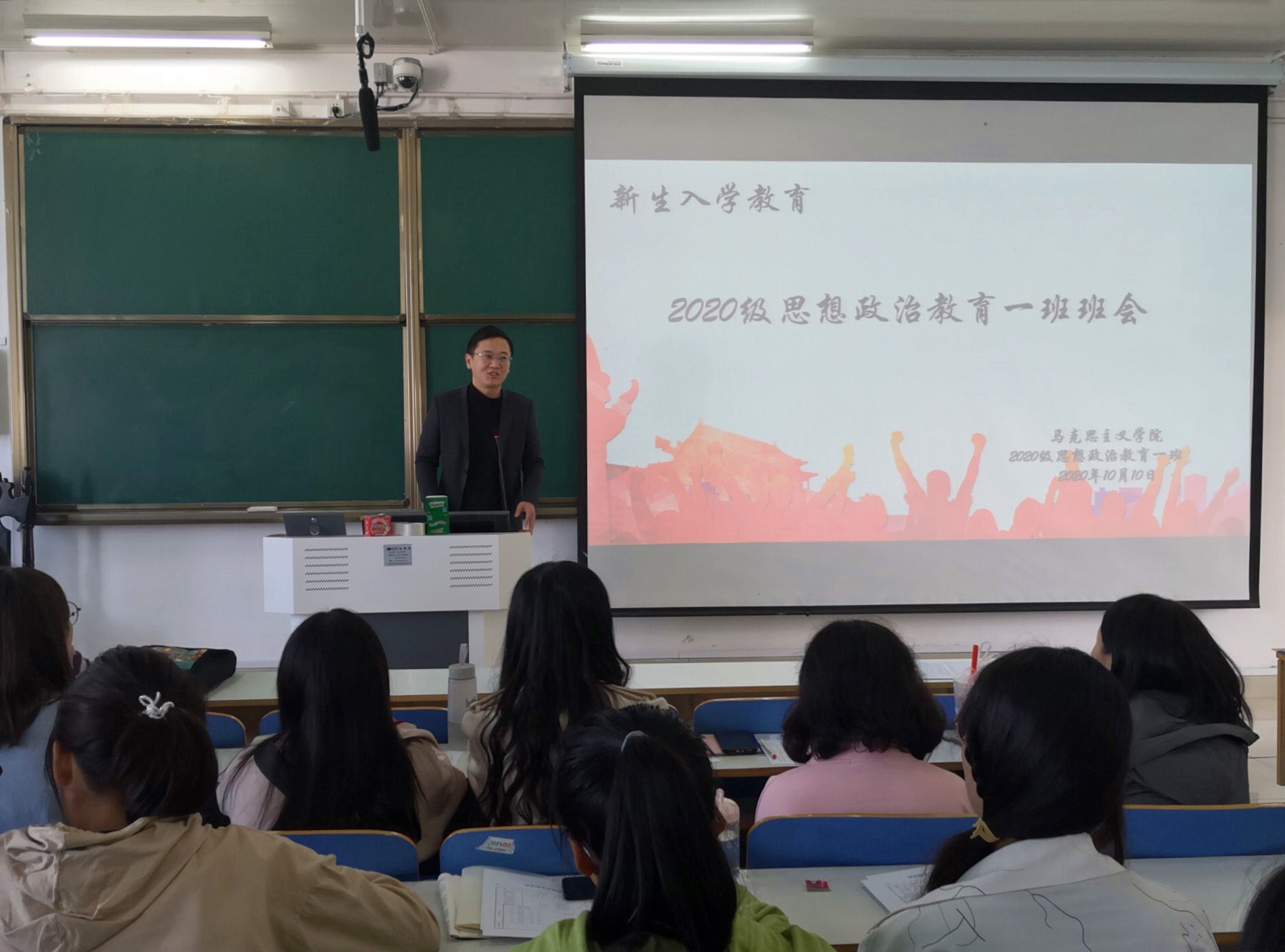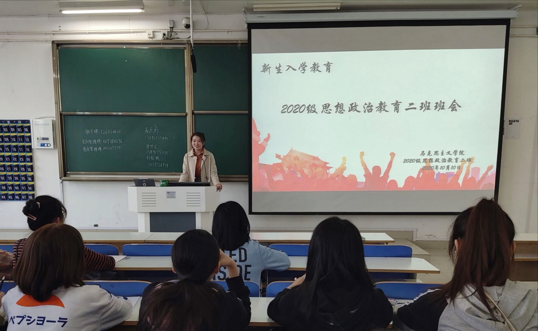 10月10日下午,2026年世界杯官网分别在社科楼514、516开展新生入学教育班会。辅导员曹栋、陶青青以及2020级全体新生共同参加了此次班会。班会由班代郭世龙、靳雨露主持。