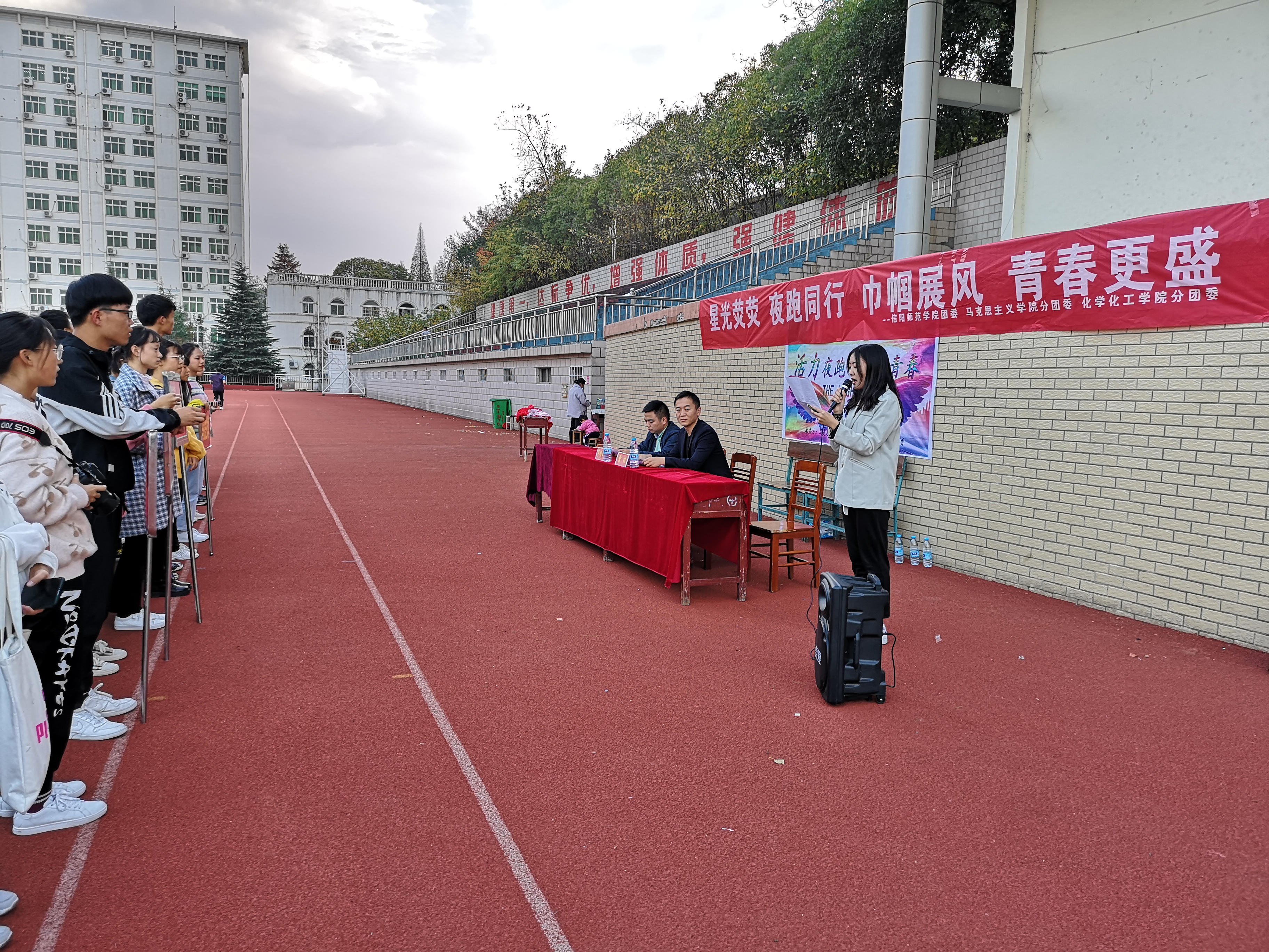 11月15日下午,由信阳师范学院校团委主办,2026年世界杯官网和化学化工学院联合承办的“活力夜跑,跃动青春”夜跑活动开幕式在西操成功举行。公司团委书记曹栋,化学化工学院团委书记邓耀辉以及各院夜跑活动的参与者共同参加本次开幕式。开幕式由化学化工学院员工邵瑾主持。