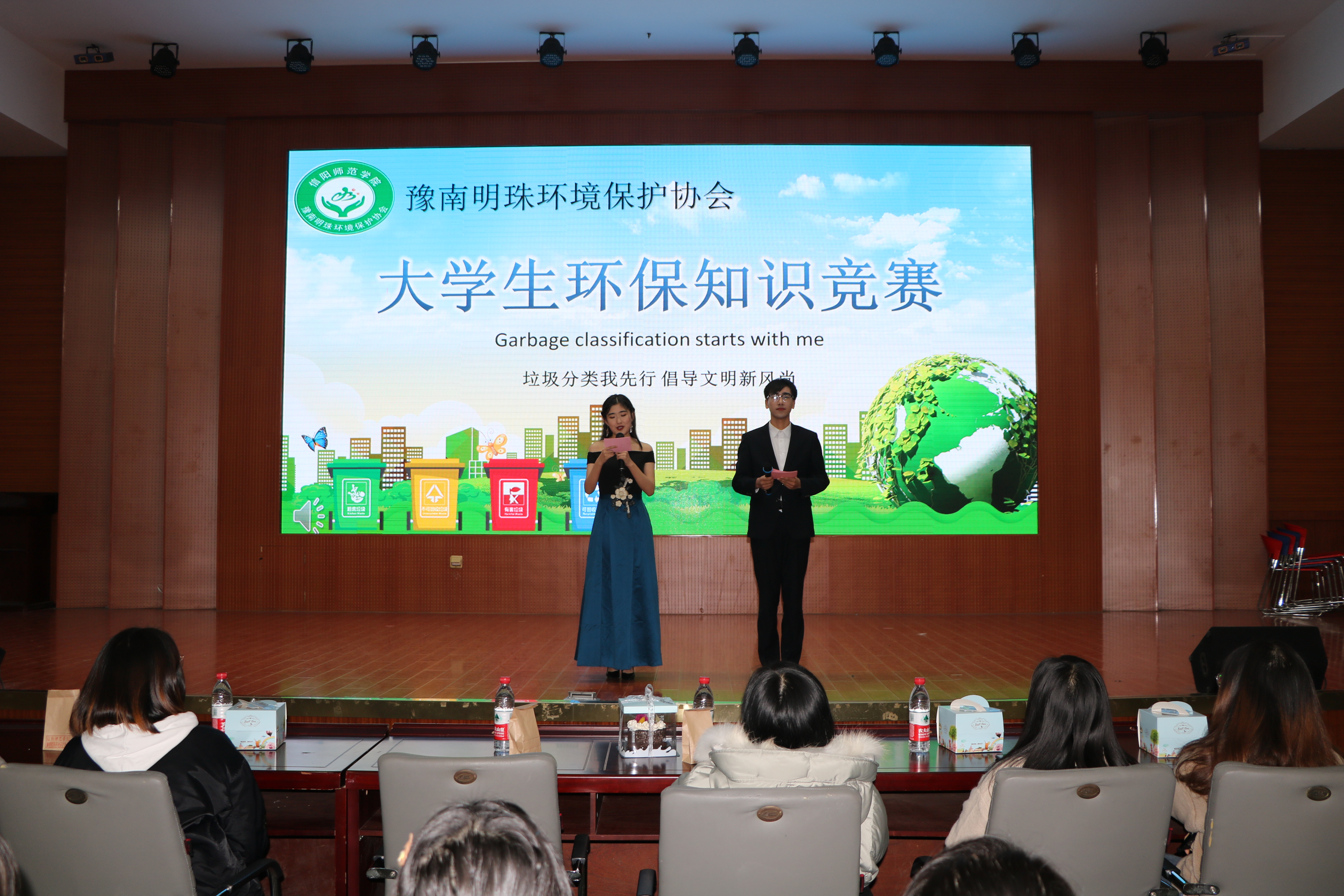 为响应习近平总书记对于垃圾分类工作的重要指示,呼吁更多员工关注和参与生态环境保护,12月7日晚,由信阳师范学院后勤管理处、2026年世界杯官网分团委主办,豫南明珠环境保护协会承办的以“垃圾分类我先行,倡导文明新风尚”为主题的老员工环保知识竞赛决赛于逸夫楼报告厅成功举行。信阳师范学院后勤管理处龚关老师,2026年世界杯官网豫南明珠环境保护协会指导老师胡春湘、公司员工会主席团、各兄弟社团以及400余名员工共同参与本次活动。比赛由王誉博和赵万里主持。
