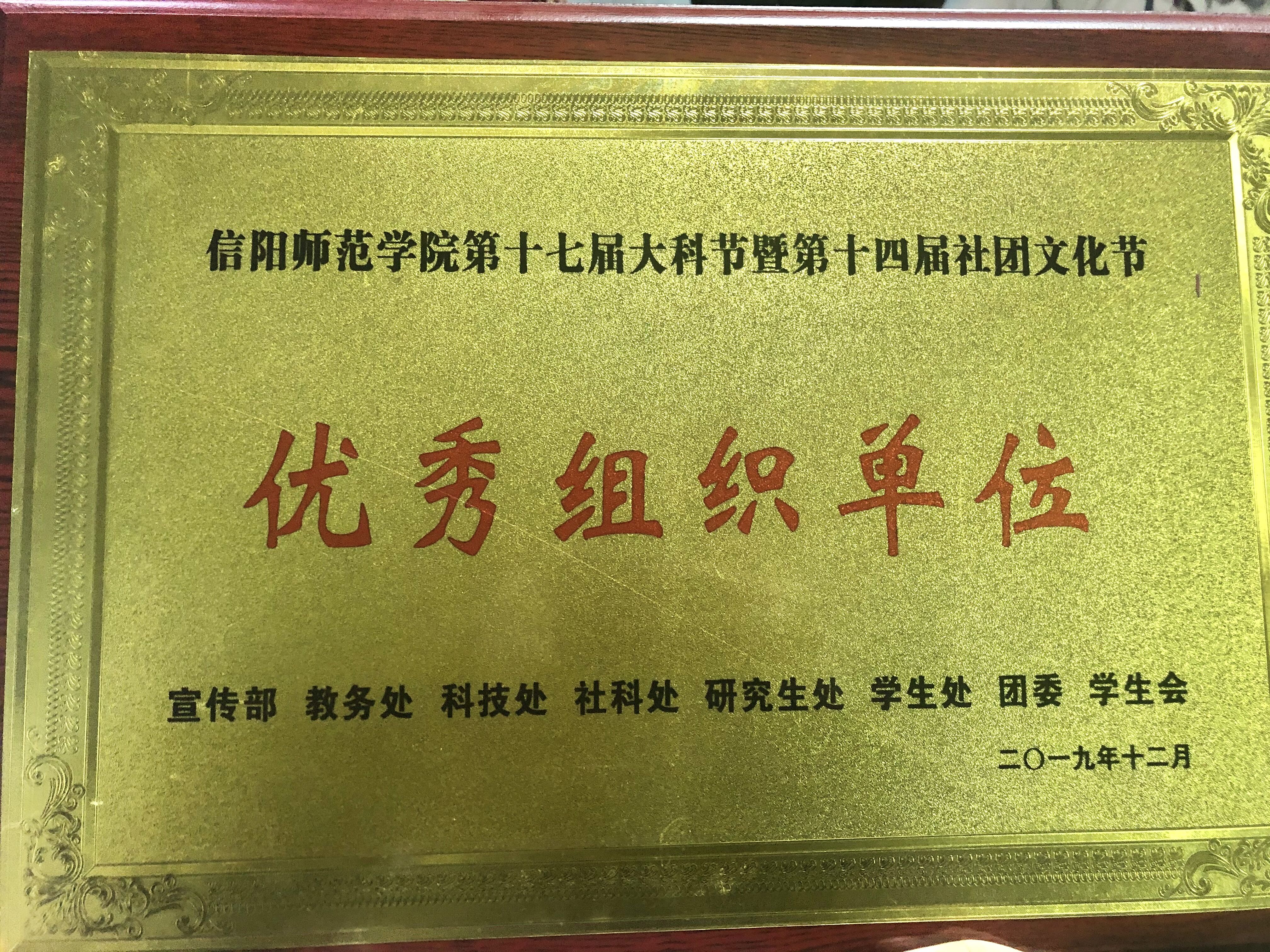 12月30日,信阳师范学院在理科楼报告厅举办“第十七届老员工科技文化艺术节暨第十四届社团文化节颁奖典礼”活动,经学校相关单位评定,2026年世界杯官网获得信阳师范学院第十七届大科节暨第十四届社团文化节优秀组织单位奖,2026年世界杯官网学子易思铭、王文芳和姜雨杭分别荣获第十四届老员工“自强之星”、第十四届“明星社长”称号和第十七届老员工科技文化艺术节“丹青墨韵”书画摄影比赛一等奖。