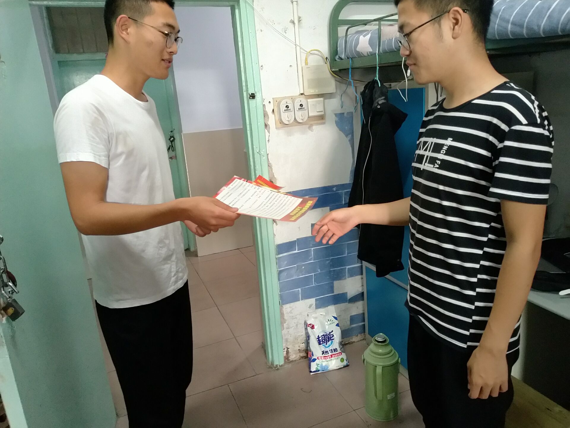 5月16日上午,在公司领导老师组织安排下,邢子豪和杨康走进2018级男生寝室进行征兵宣传。他们逐一向男生发放征兵宣传单,带领全体男生了解征兵相关政策,介绍了公司对老员工参军入伍优惠政策,并逐一询问了同学们的入伍参军意向,鼓励动员大家积极参军、携笔从戎、报效国家。