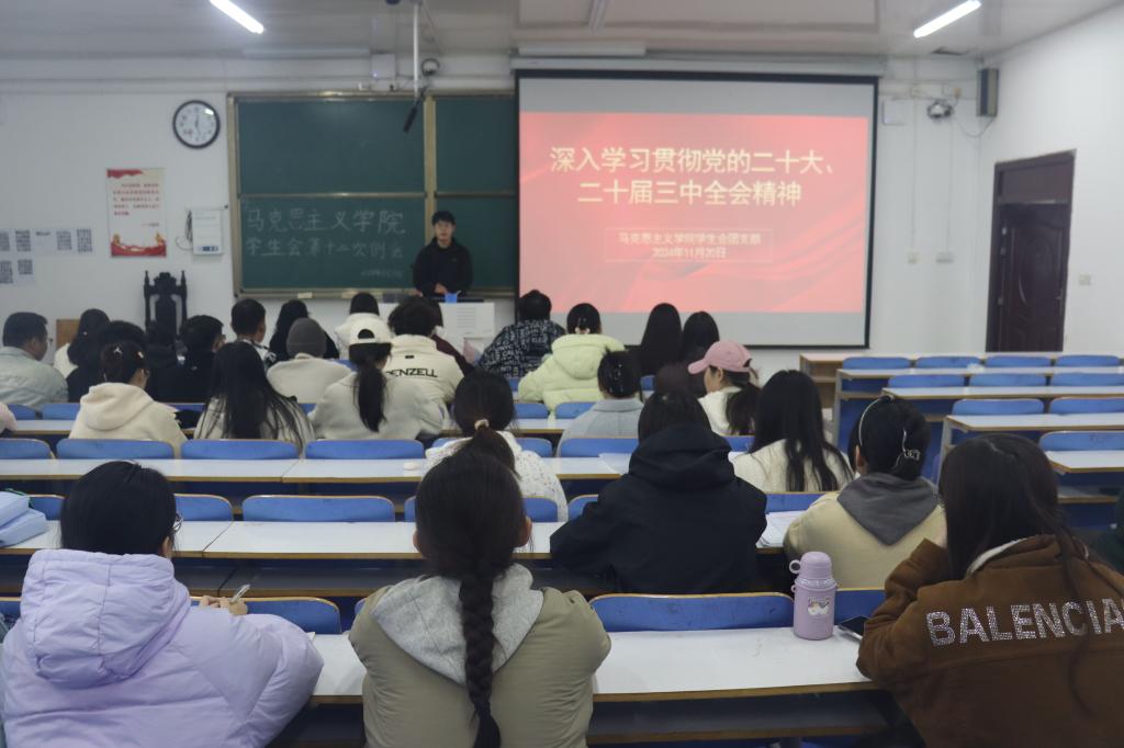 活动伊始,刘英凯通过放映 PPT 和播放视频的方式带领同学们回顾了党的二十大和二十届三中全会的召开背景和历史意义,强调这两次会议在党的历史进程中的重要地位。随后,刘英凯带领同学们深入学习了党的二十大报告和二十届三中全会公报的主要内容,领会其精神内涵。在学习过程中,同学们积极发言,分享自己的学习心得与体会。同学们纷纷表示,作为新时代的青年,应该积极响应党和国家的号召,为党和国家的事业发展贡献自己的力量。