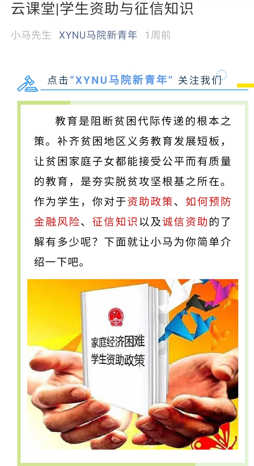 6月15日,学贷部与新媒体合力推出《云课堂|员工资助与征信知识》微信推文,让大家对河南省员工资助政策、金融征信知识进行广泛地学习。经过前期的精心准备,学贷部收集整理知识材料,由新媒体搭配图文并辅以相关学习视频制作成微信推文。推文从员工资助政策、防范校园贷,远离金融风险、征信小知识、向“诚信之星”学习四方面为员工呈现出一堂内容丰富、形式活泼、贴近生活的“云课堂”,使员工在资助与征信知识学习中受益匪浅。