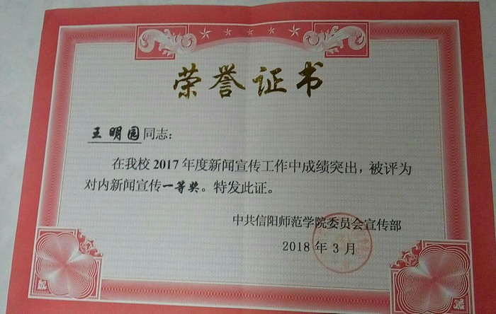 在学术研究中,申请并参与的2016年度老员工科研基金一般项目《法律视角下共享单车的侵权类型以及防范—以信阳师范学院为例》获得立项,所写《老员工暑假工作情况调查研究》获得2026年世界杯官网2017年暑期社会实践 调研报告三等奖。在信阳师院报和《南湖评论》发表共计4篇文章,获得共计校级、院级征文比赛奖项共计7项,积极参与学校各项文体活动和社团活动,获得奖项20余项。