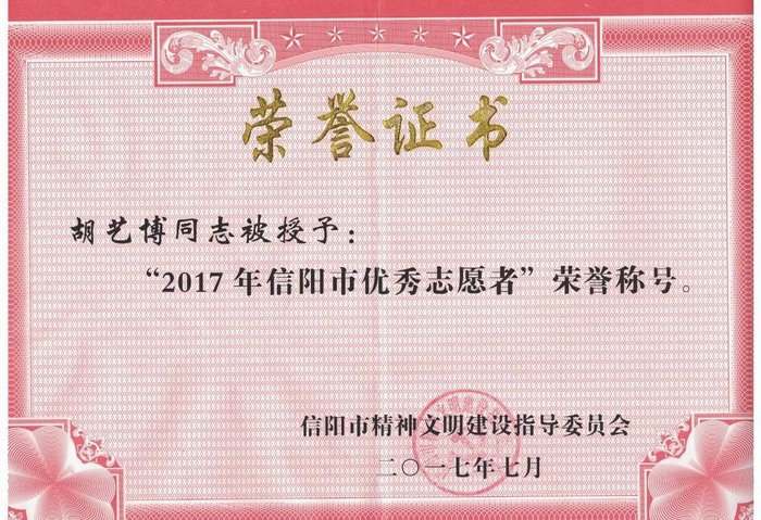 工作方面:该生担任环境保护协会会长期间,以“形式多样、内容丰富,立足实际、服务同学”为宗旨开展多项特色活动,多次被评为“优秀社团干部”、“先进个人”、“社团活动积极分子”;被信阳市精神文明建设指导委员会授予“2017年信阳市优秀志愿者”荣誉称号。担任员工会副主席期间,协助老师完成学院系列工作,牢固树立为员工服务,为学院服务的理念。任职期间,组织参与了学院的迎新活动、元旦晚会、运动会训练与后勤、讲价值观故事,实现青春梦想、毕业典礼等多项活动。担任审核评估员工助理期间,协助学院领导老师整理评估材料、检查试卷、论文、档案、实习材料、教案教纲等。