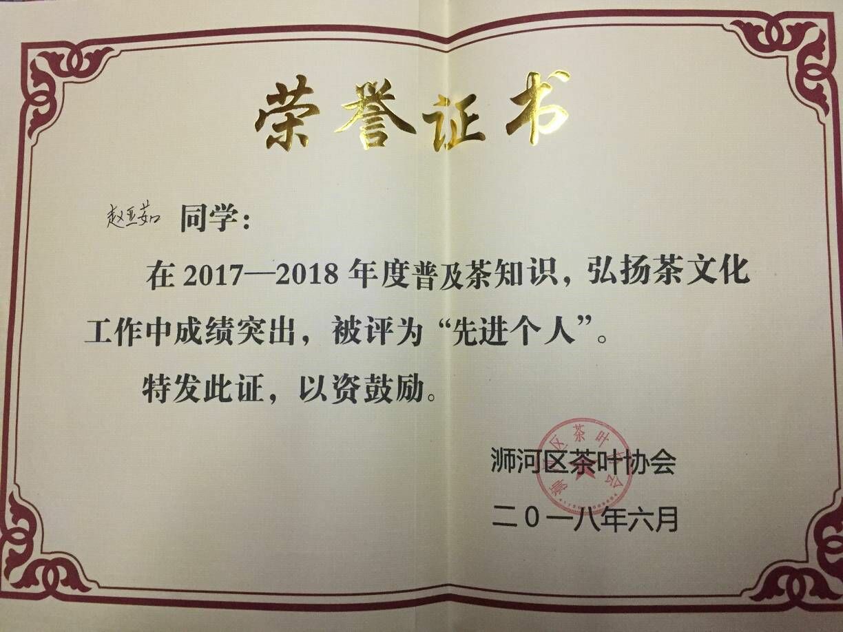 在工作中,2016年12月,被聘任为校史馆和茶学实训基地志愿者协会会员。2016年12月,在公司2016年度广播宣传工作中荣获二等奖。2017年6月,荣获信阳师范学院广播宣传先进个人一等奖。2017年7月,在2016-2017年度普及茶知识,弘扬茶文化工作中被评为“先进个人”。在2017年11月,在信阳师范学院新生广播操中,授予“优秀组织者”称号。2018年3月,在公司2017年度新闻宣传工作中,被评为对内新闻宣传三等奖。2018年6月,荣获信阳师范学院2017-2018学年广播宣传先进个人一等奖。在2018年6月,2017-2018年度普及茶知识,弘扬茶文化工作中,被评为“先进个人”。2018年8月,被聘任为浉河区茶叶协会志愿者。2018年8月,被聘任为信阳师范学院校史馆志愿者协会会长。