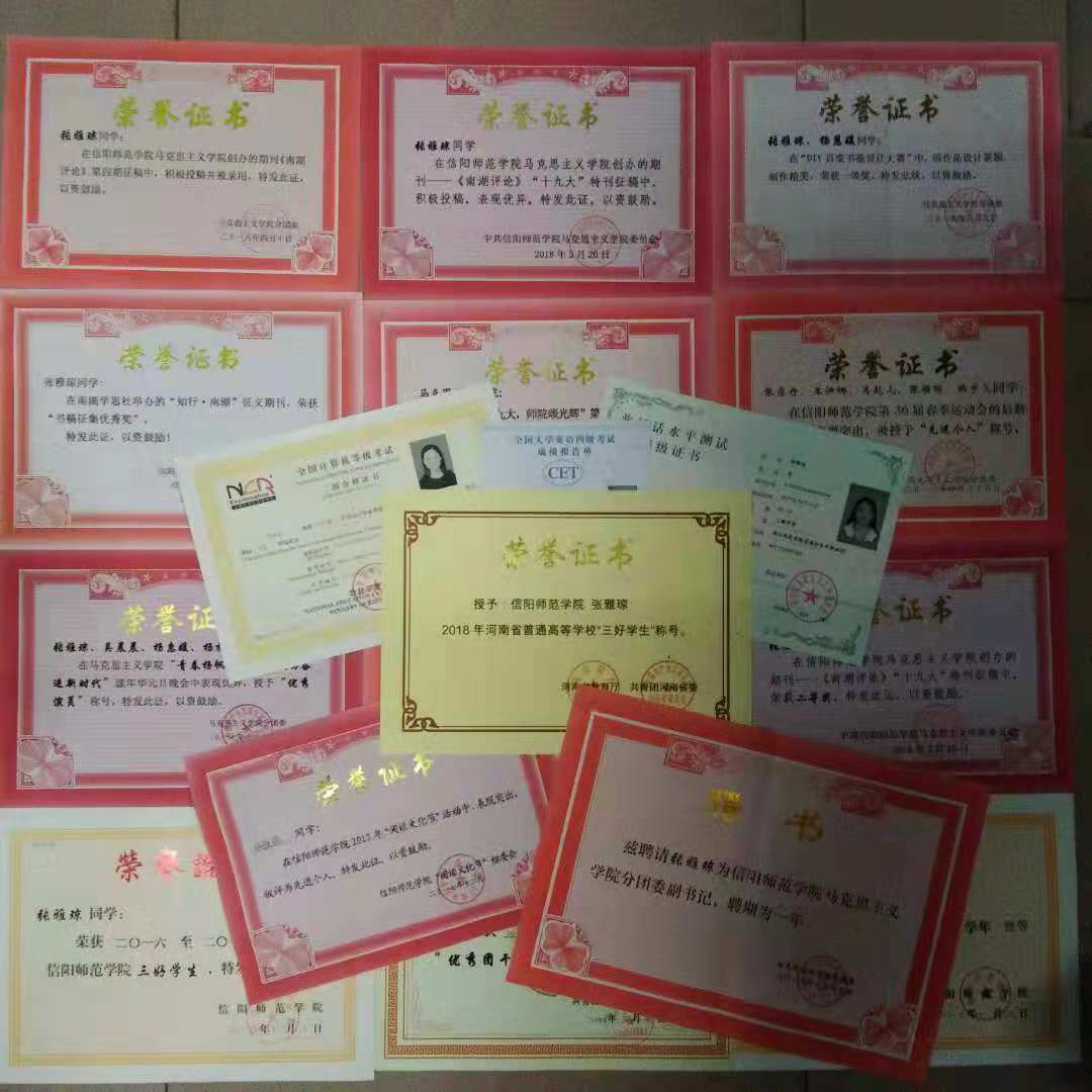 学习之余,积极锻炼写作能力。2018年5月,在《知行•南湖》发表《坚定理想信念,做新时代新青年》一文,并荣获“书稿征集优秀奖”。在院刊《南湖评论》中发表《从< 习近平的七年知青岁月>中汲取奋斗力量》、《让理想信念点燃青春梦想》等文,在2018年3月《南湖评论》“十九大”特刊征稿中,荣获二等奖;2017年12月,在信阳师范学院阅读文化节中被评为“先进个人”。