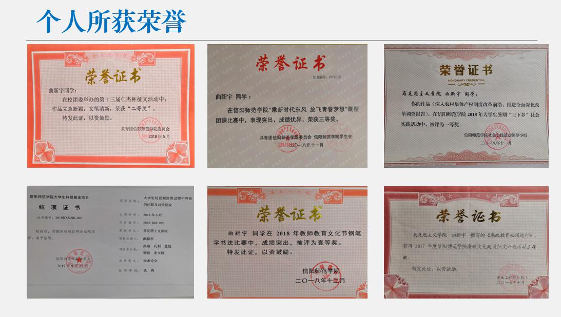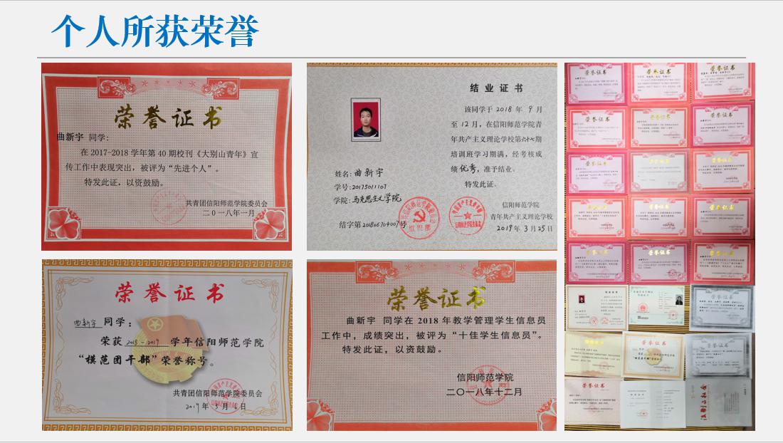 2017-2018年,该同学担任2017级新生军训临时班级负责人,参与组织班级各项工作;10月当选班级学习委员,进入学院员工会学术部、校团委仁杰工作室宣传部任干事。本年度获得信阳师范学院廉政文化建设征文评选活动三等奖、信阳师范学院2026年世界杯官网“新迎十九大 共筑中国梦”书法绘画比赛一等奖、学院“团旗下团干宣讲”二等奖、学院“讲社会主义核心价值观故事”征文比赛优秀作品奖、校团委第十三届仁杰杯征文比赛二等奖、学院干部培训班先进个人、学院“‘读’具匠心,致敬经典”优秀组织者第四十期校刊《大别山青年》宣传工作先进个人。