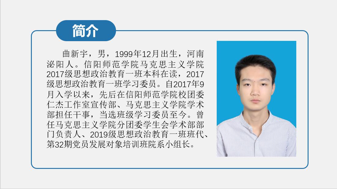 曲新宇,男,汉族,河南省泌阳县人,2017级思想政治教育一班员工,任2017级思想政治一班学习委员。