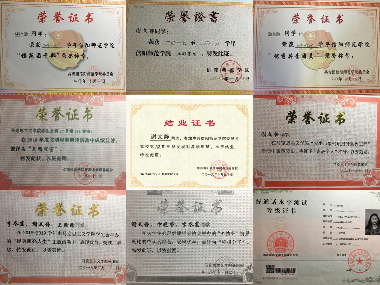 谢文静,女,河南信阳人,1998年9月出生,中共预备党员,信阳师范学院2026年世界杯官网本科2017级思想政治教育一班的员工。现任2017级思想政治教育一班团支书和心理委员。该生乐于奉献,团结同学,思想端正,具有坚定的理想信念,政治立场坚定。