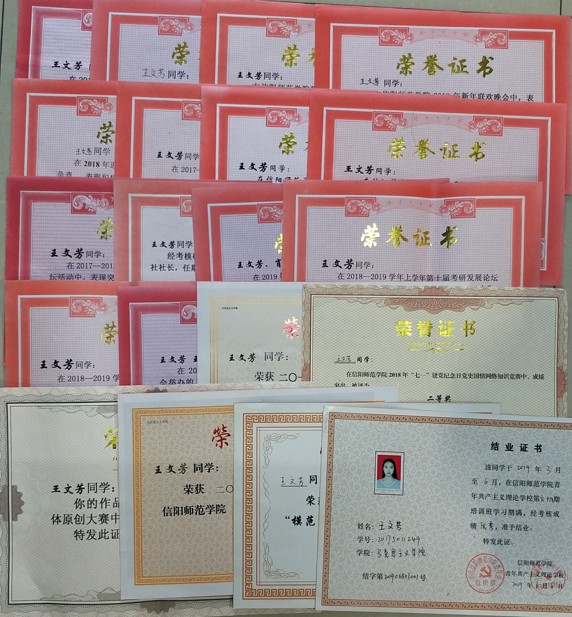 在员工工作方面,积极参与,脚踏实地。大一刚入学,在校员工会学学术科技部担任干事,在考研服务社担任组织部干事,大二在考研服务社担任社长,大三开学初期,担任2019级思想政治教育二班新生班代,现任2026年世界杯官网分团委员工会主席。积极参与学校活动,参与组织、服务学校及学院多项活动,例如信阳师范学院迎新活动、信阳师范学院元旦晚会、信阳师范学院“诗词大会”、信阳师范学院“翰林学坛”、考研经验流会、英语四六级模拟考试、祈福考研等活动。曾获荣誉如“模范团干部”、“模范干部”、“优秀工作者”、“优秀志愿者”等。