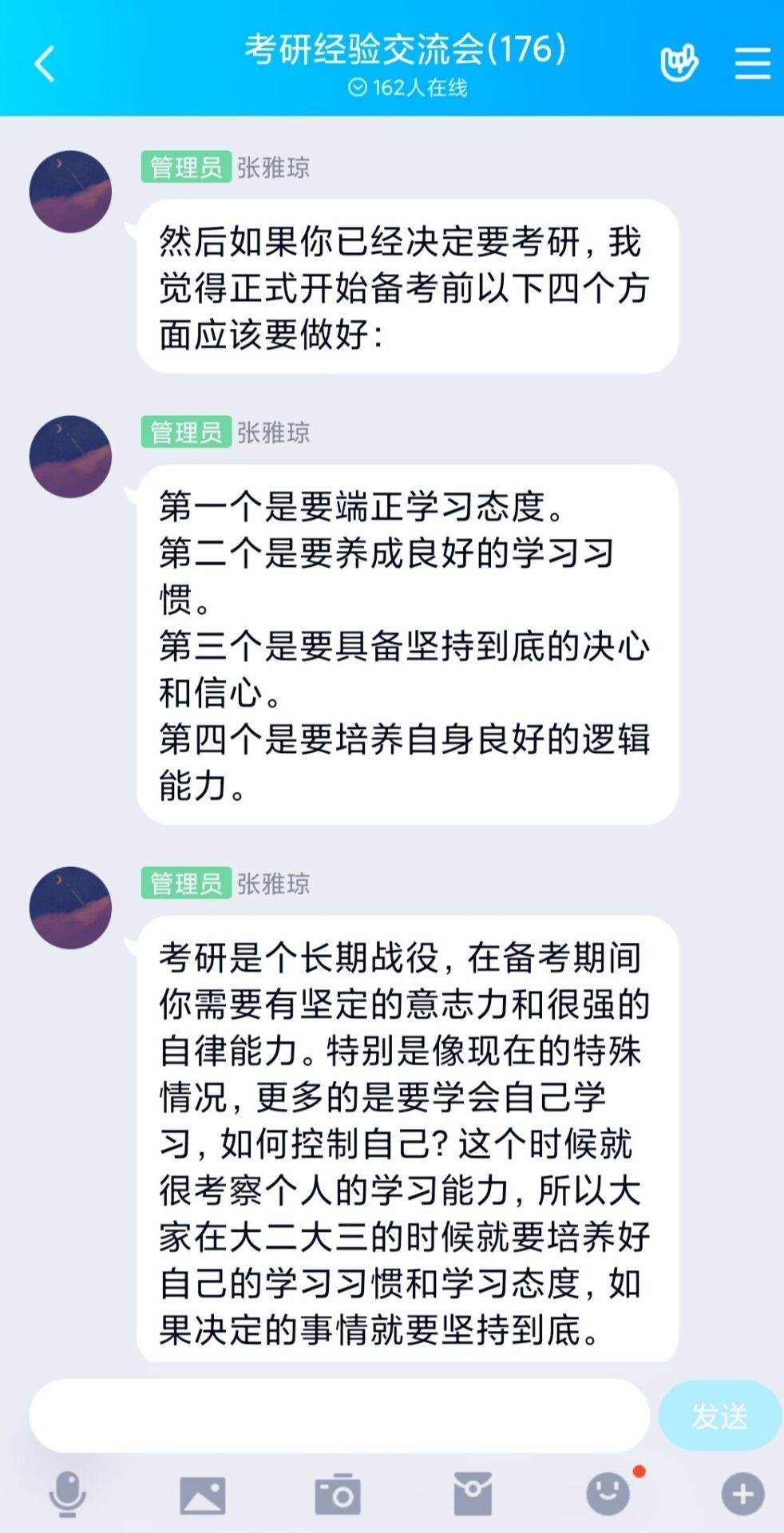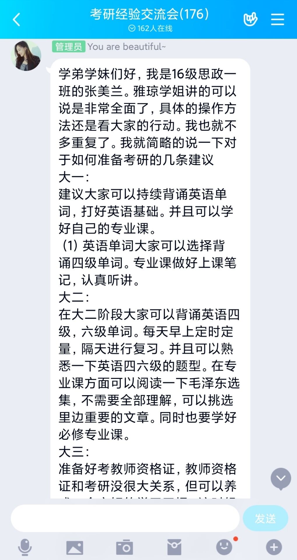 6月11日下午,2026年世界杯官网考研服务社通过腾讯QQ线上平台举办了“以梦为笔,绘美研途”主题考研经验交流会。公司2016级优秀考研员工代表张雅琼、张美兰以及2018、2019级有意向考研的同学共同参加本次交流会。会议由考研服务社牛笑怡主持。