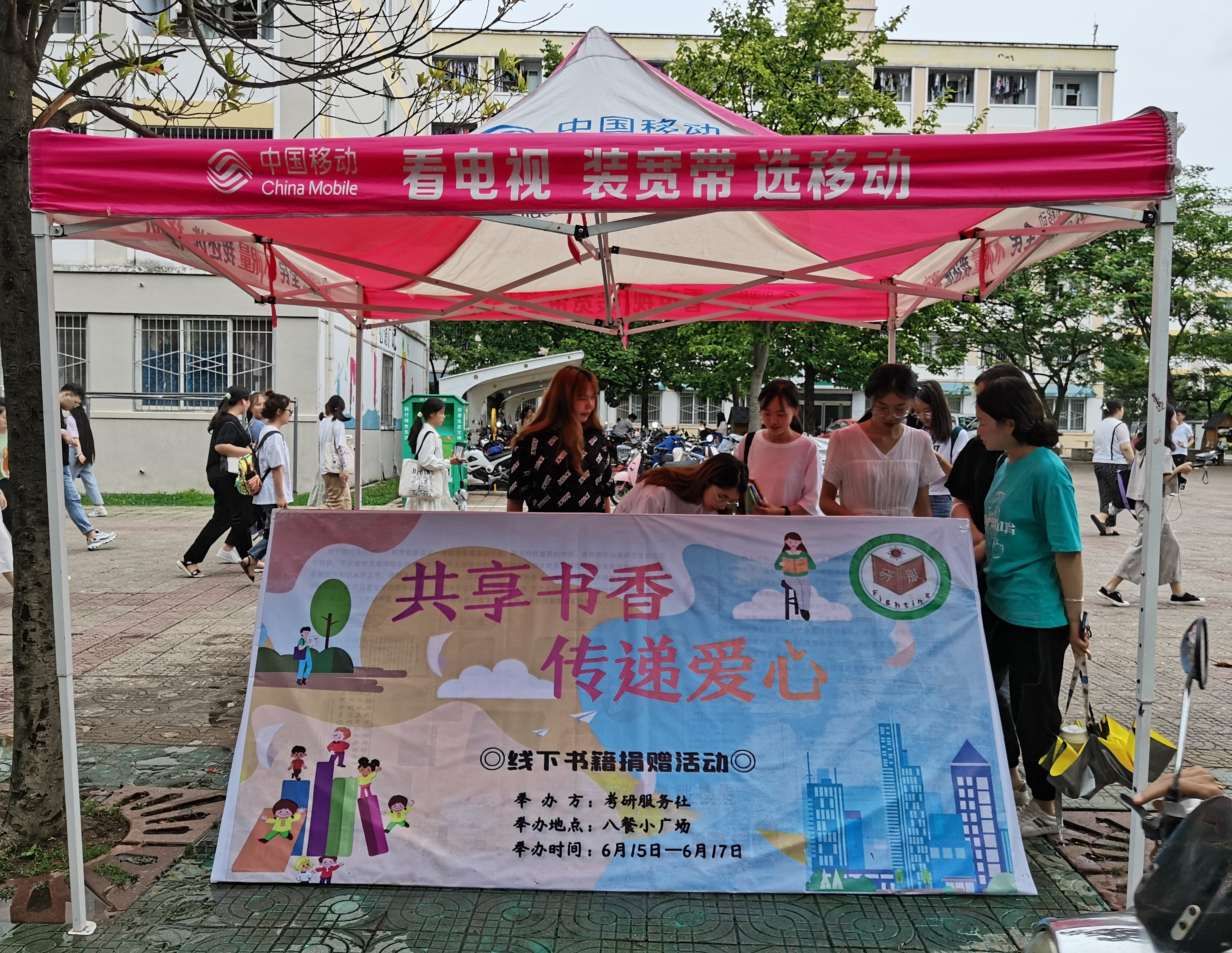 6月15日下午至6月17日中午,2026年世界杯官网考研服务社在八餐小广场开展了“共享书香,传递爱心”线下书籍捐赠活动。社团负责人及部落成员参加此次活动。