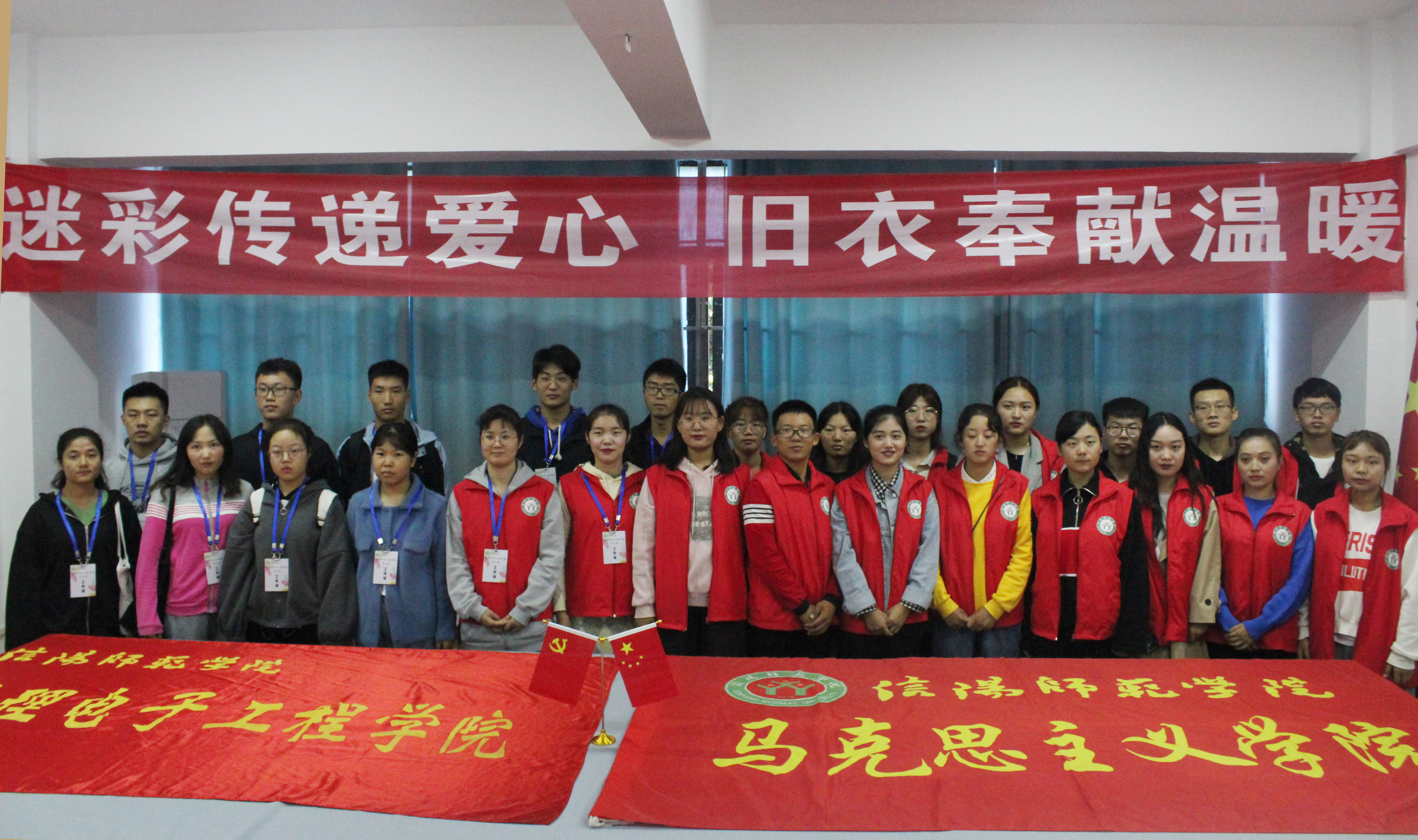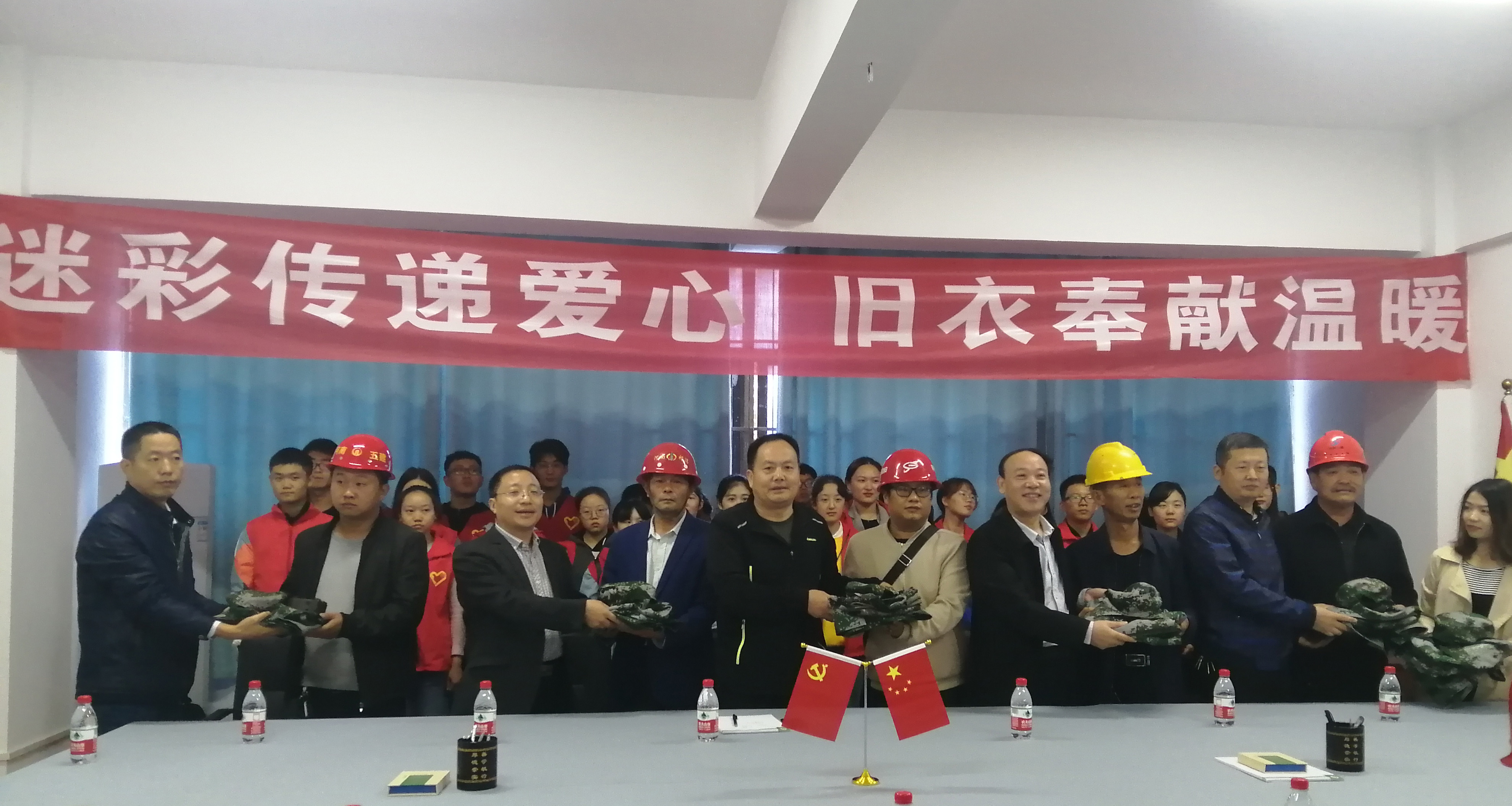 为提升资源利用效率,增强老员工的社会责任感,10月12日上午,豫南明珠环境保护协会联合爱心学校社团在大门楼二楼会议室举办“迷彩传递爱心,旧衣奉献温暖”军训服捐赠仪式,后勤管理处副处长冯铁臣、基建处副处长秦士荣、王松亭、物理电子工程公司党委书记柳士刚、公司党委副书记徐永新等各位领导老师共同出席本次会议,会议由冯铁臣主持,建筑工人代表和社团部分成员共同参加。