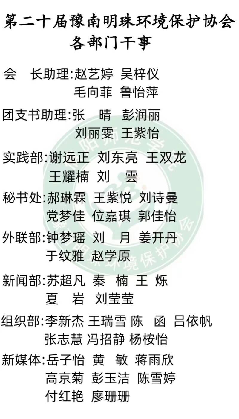 为加强社员间的交流,增进社员间的关系,营造和谐的社团氛围,10月22日晚,豫南明珠环境保护协会2020-2021学年第一次全会暨部门招新在社科楼516教室顺利举行。员工会分管主席、前会长、前团支书、现任会长、现任团支书及各部部长共同出席了本次会议。全体社员共同参加了本次会议。会议由会长劳文萍主持。