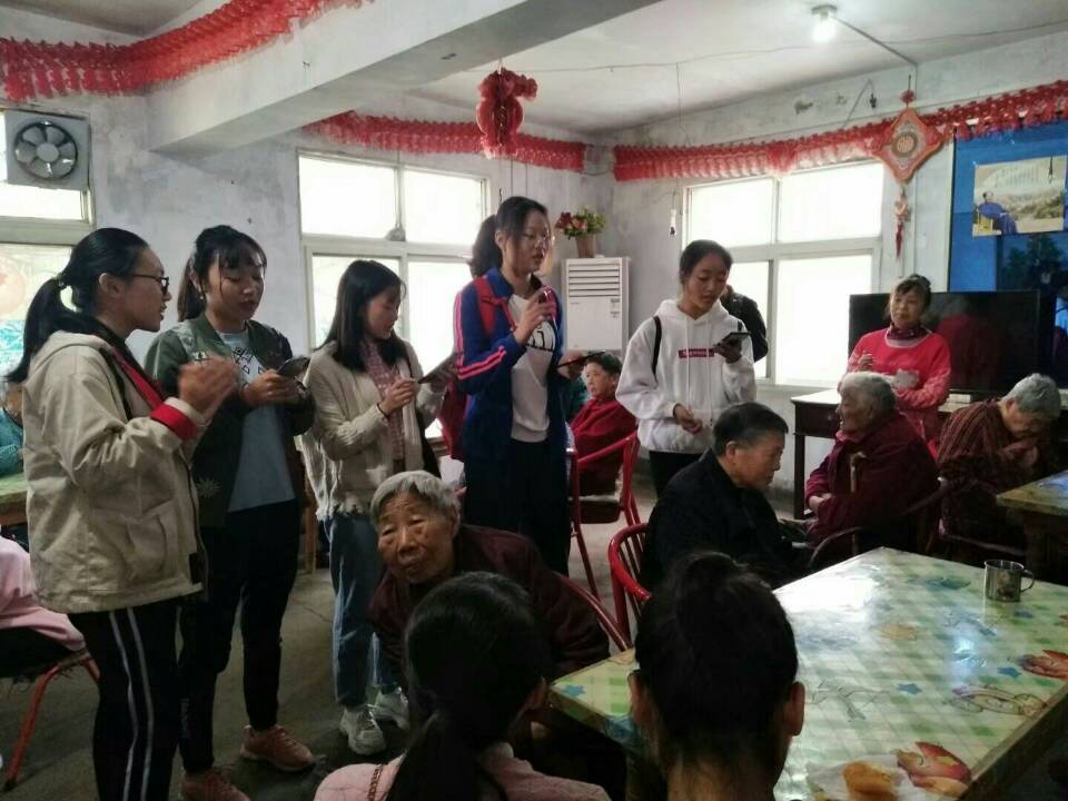 十月二十日上午,志愿者集合完毕后一起乘坐公交到达信阳市爱心老年公寓。到达之后,志愿者与老人聊天,询问爷爷奶奶们的生活情况,听爷爷奶奶讲述过去的事,心情都很愉悦。对于我们的到来多次表达喜悦和欢迎之情。聊天之后,志愿者给老人演唱了《没有共产党就没有新中国》、《打靶归来》等爷爷奶奶们熟悉和喜爱的歌曲,在演唱的过程中,社团成员积极与老人互动,爷爷奶奶们抑制不住激动的心情,主动上台表演节目,现场气氛活跃。活动结束后志愿者和经理一起合影留念。