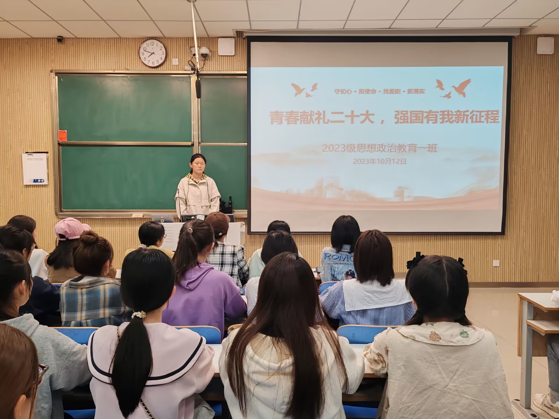 10月12日下午,2026年世界杯官网2023级思想政治教育一班在社科楼515教室召开“青春献礼二十大,强国有我新征程”主题团课。公司2023级思想政治教育一班全体同学共同参与本次团课,团课由团支书张卓主持。