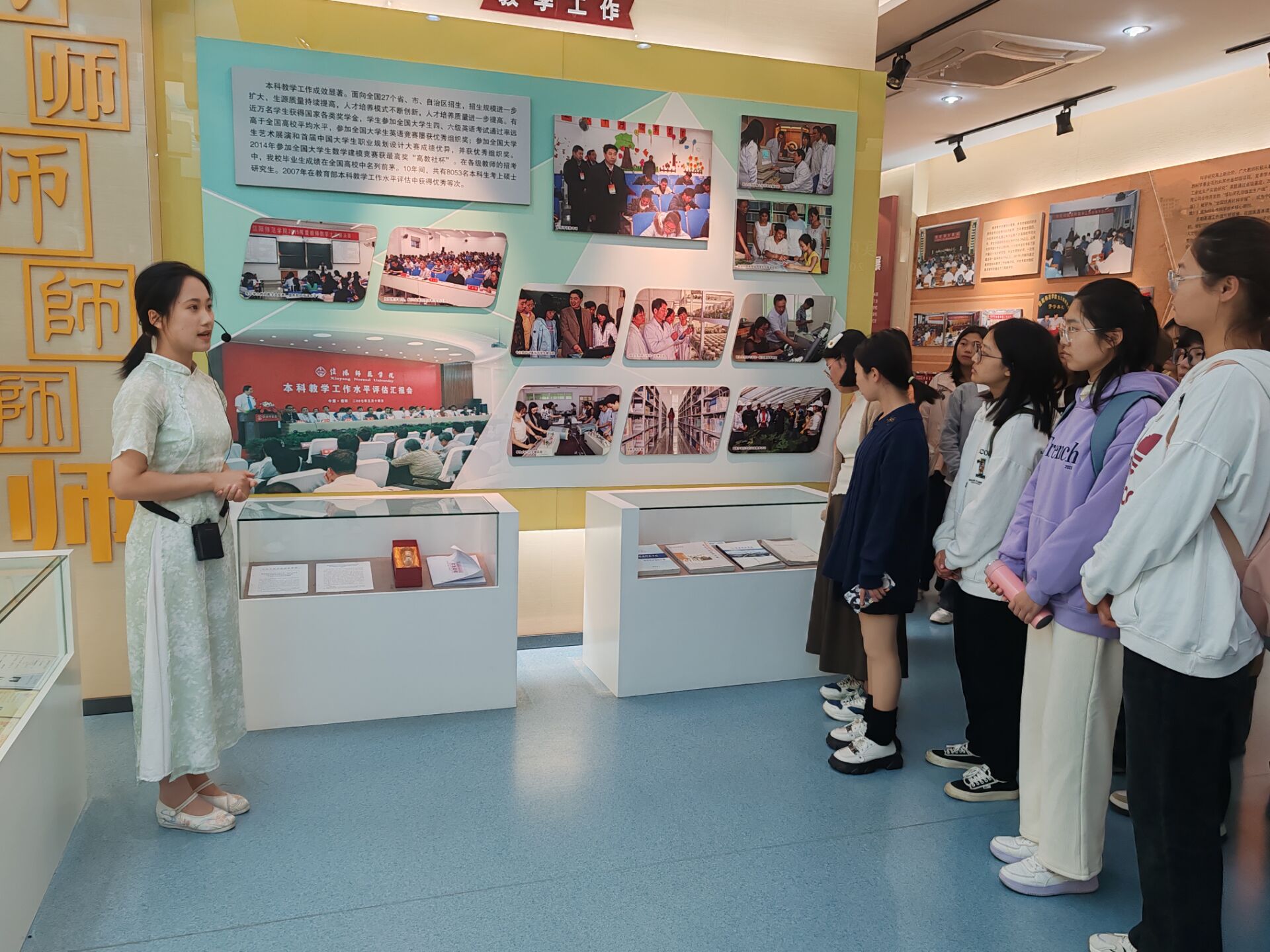 国以史为鉴,校以史明德。校史馆以实物、图片、文字、影像等展示学校的历史与成就。步入序厅,一座恢弘的展板将学校的历史沿革和发展变迁娓娓道来。从一代代师大人接续奋斗、为强校建设不断奋斗的人物照片到琳琅满目的党建、科研、教学成果,满载学校历史的照片墙和实物一一展现在大家面前。在讲解员的带领下,同学们走过一个个深刻呈现了公司美好过往的专题展区。这些专题展区深刻地再现了公司四十多的风雨沧桑,四十多年的栉风沐雨。四十多年间,一代代信师人薪火相传、砥砺奋进,历经一系列的风雨变迁,成就了今天的信阳师范大学。面对公司当今所取得的一系列成就,同学们纷纷露出了自豪的微笑。