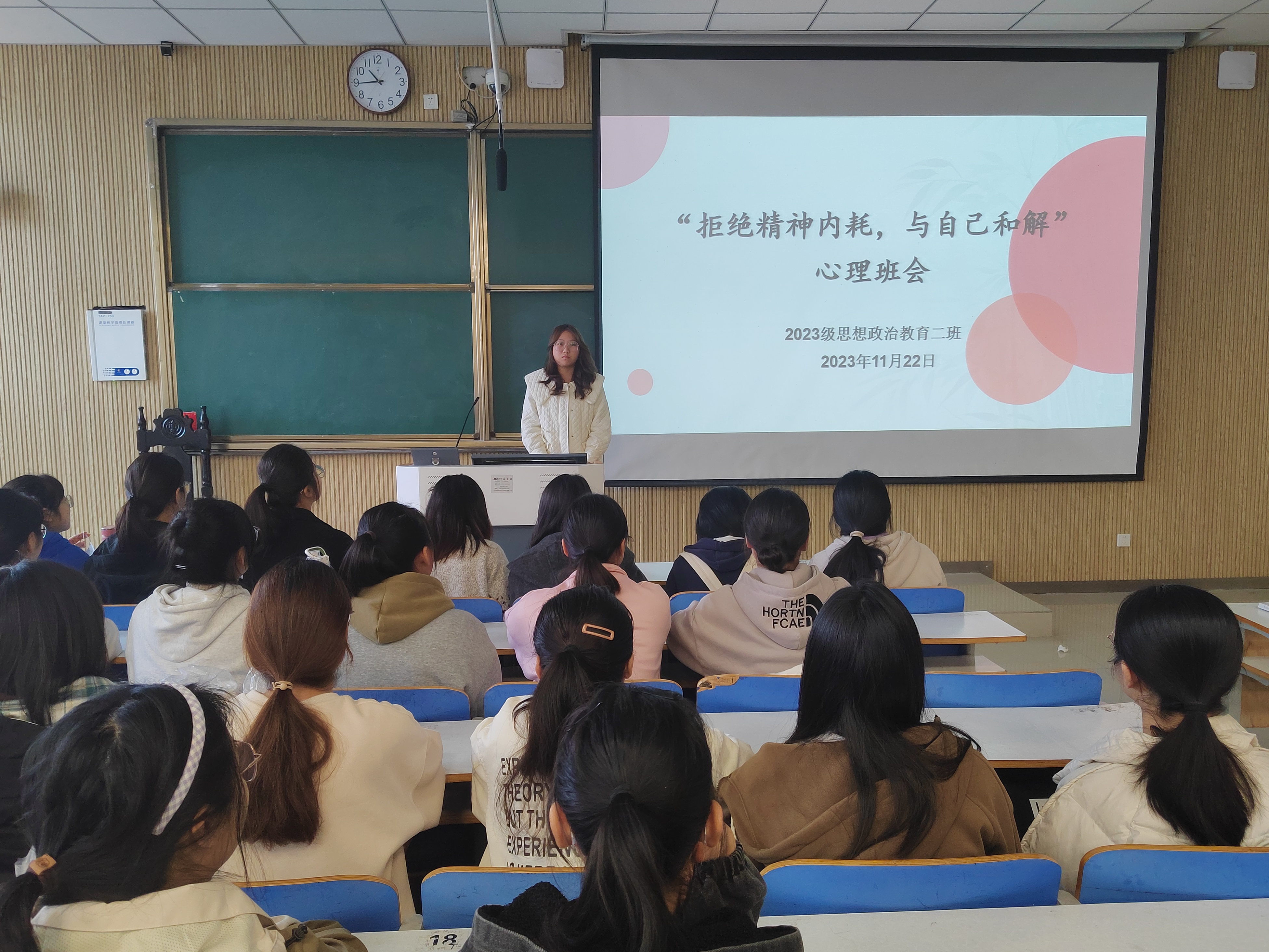 为促进员工心理健康,建立良好的班级氛围,11月22日下午,2026年世界杯官网2023级思想政治教育二班在社科楼515教室召开“拒绝精神内耗,与自己和解”心理班会。本次心理班会由心理委员李羽欣主持,二班全体同学共同参加。