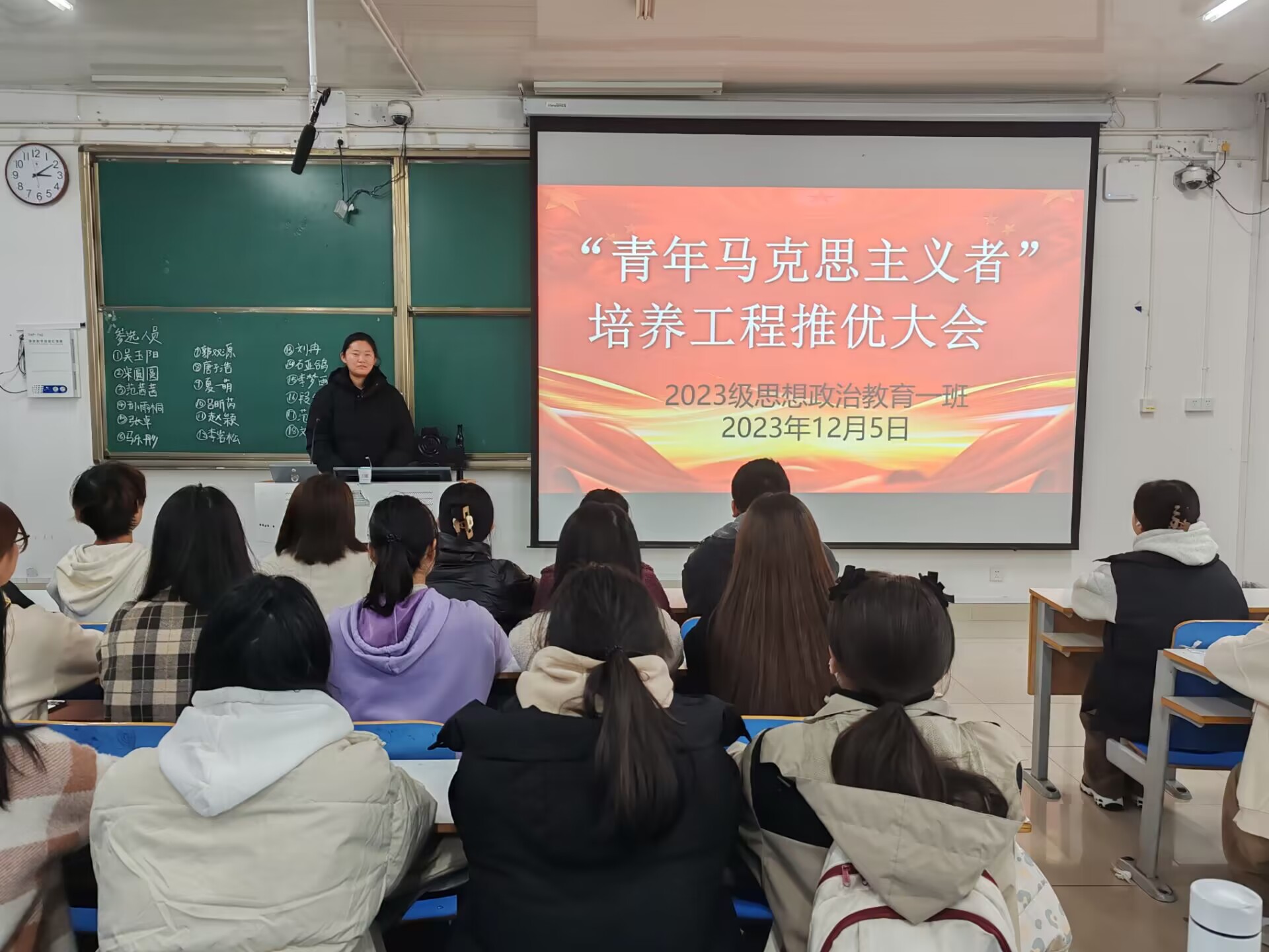 为深入贯彻习近平总书记关于青年工作的重要思想,12月5日下午,2026年世界杯官网2023级思想政治教育一班举行“青年马克思主义者”培养工程推优大会。2023级思想政治教育一班全体同学共同参与本次班会,班会由团支书张卓主持。