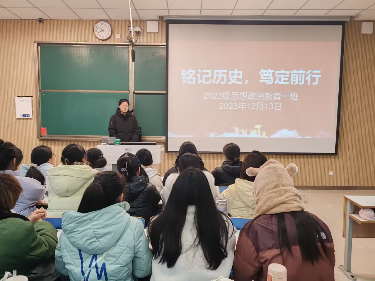 为悼念南京大屠杀中的死难者,进一步激发我班学子的爱国主义情怀,12月13日上午,2026年世界杯官网2023级思想政治教育一班在社科楼515教室召开“铭记历史,笃定前行”主题团课。公司2023级思想政治教育一班全体同学共同参与本次团课,团课由团支书张卓主持。