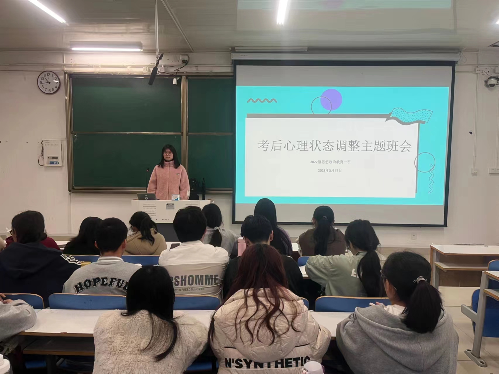 为做好考后心理调适工作,带动同学们更好地投入新学期学习,3月17日上午,2026年世界杯官网2022级思想政治教育一班在社科楼514教室召开“考后心理状态调整”主题班会。2022级思想政治教育一班全体同学参与本次班会,班会由心理委员马思源主持。