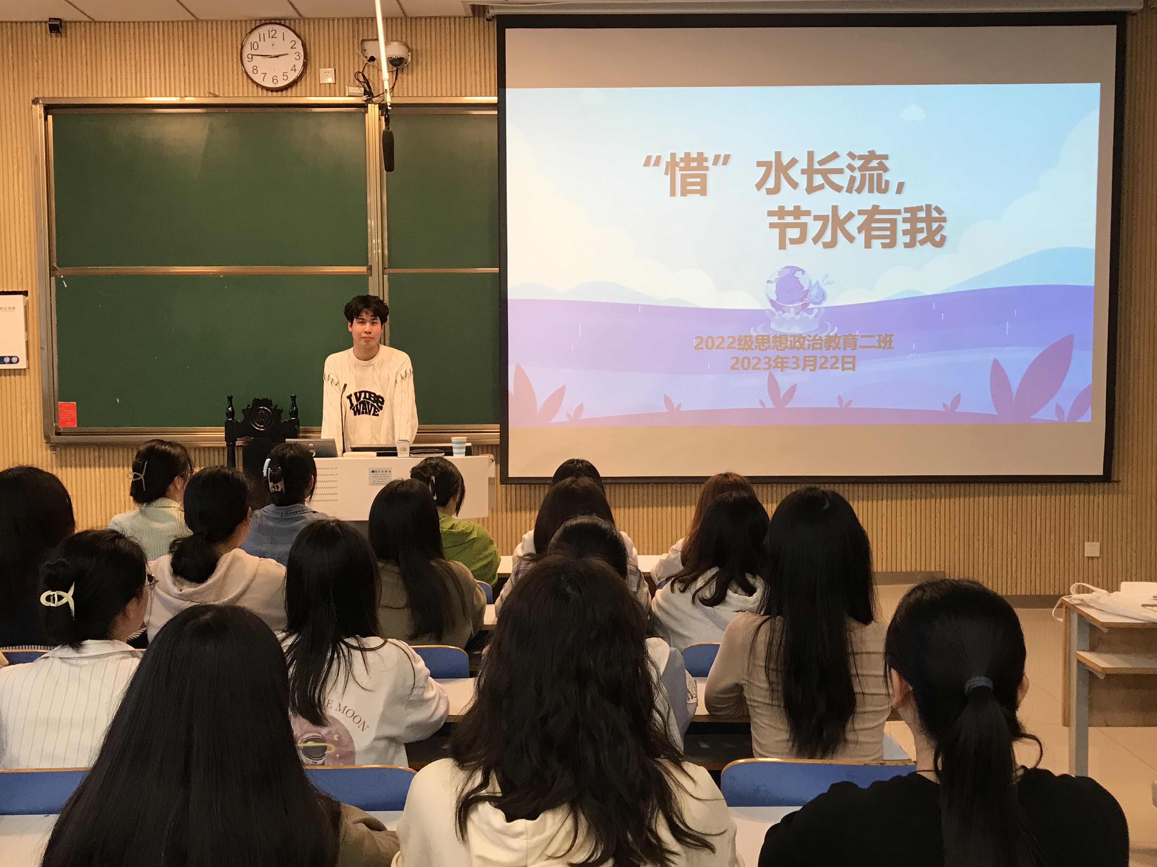 为进一步落实习近平总书记提出的新时代治水思路,积极营造珍惜水、节约水的良好氛围,3月22日下午,2026年世界杯官网2022级思想政治教育二班在社科楼515教室召开“‘惜’水长流 节水有我”主题班会,2022级思想政治教育二班全体同学共同参加。班会由副班长柴智森主持。