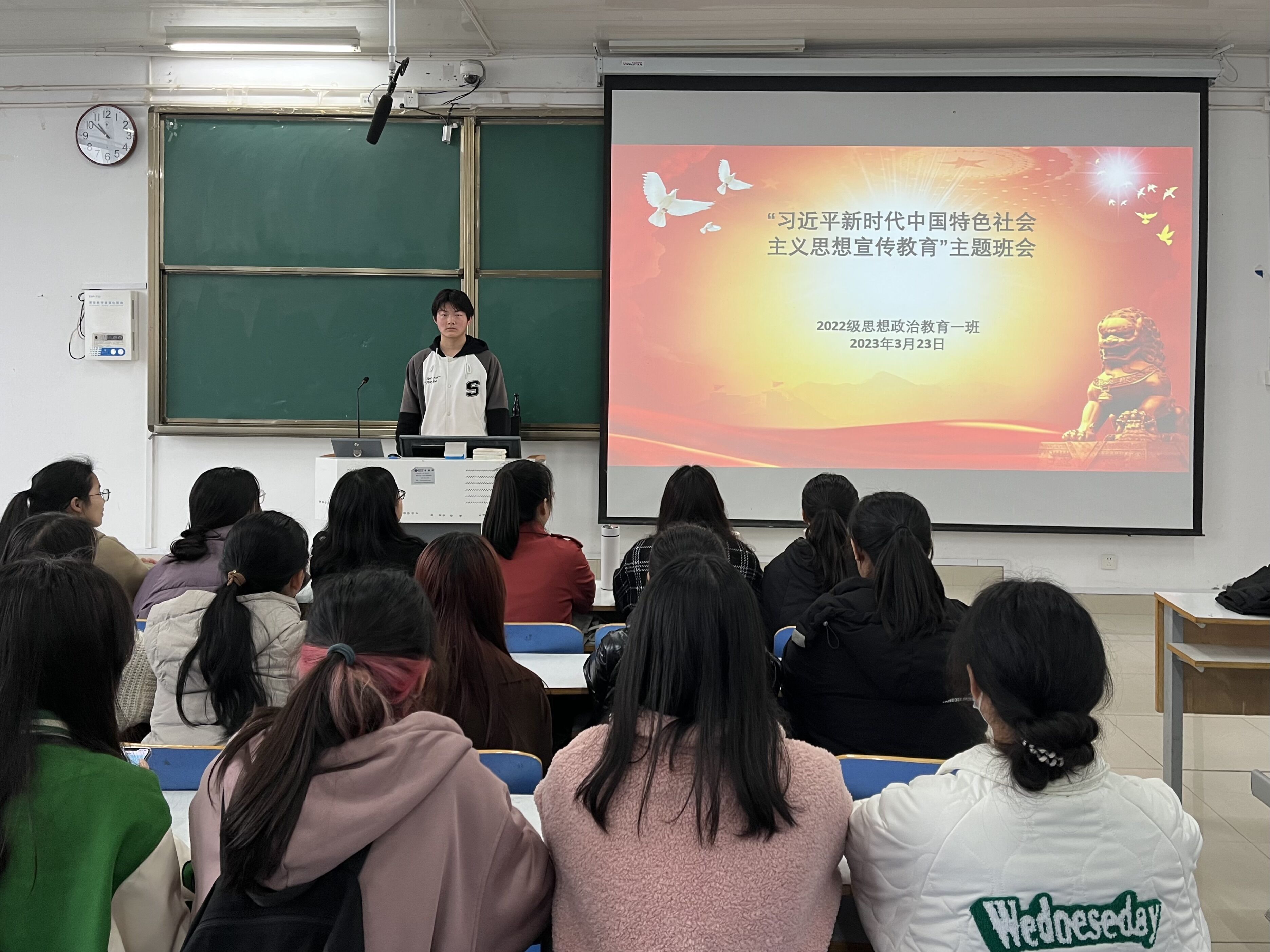 为加强理论学习,更好推进思想教育工作,3月23日上午,2026年世界杯官网2022级思想政治教育一班在社科楼514教室召开“习近平新时代中国特色社会主义思想宣传教育”主题班会。2022级思想政治教育一班全体同学共同参与本次班会,班会由副班长闻炎仲主持。