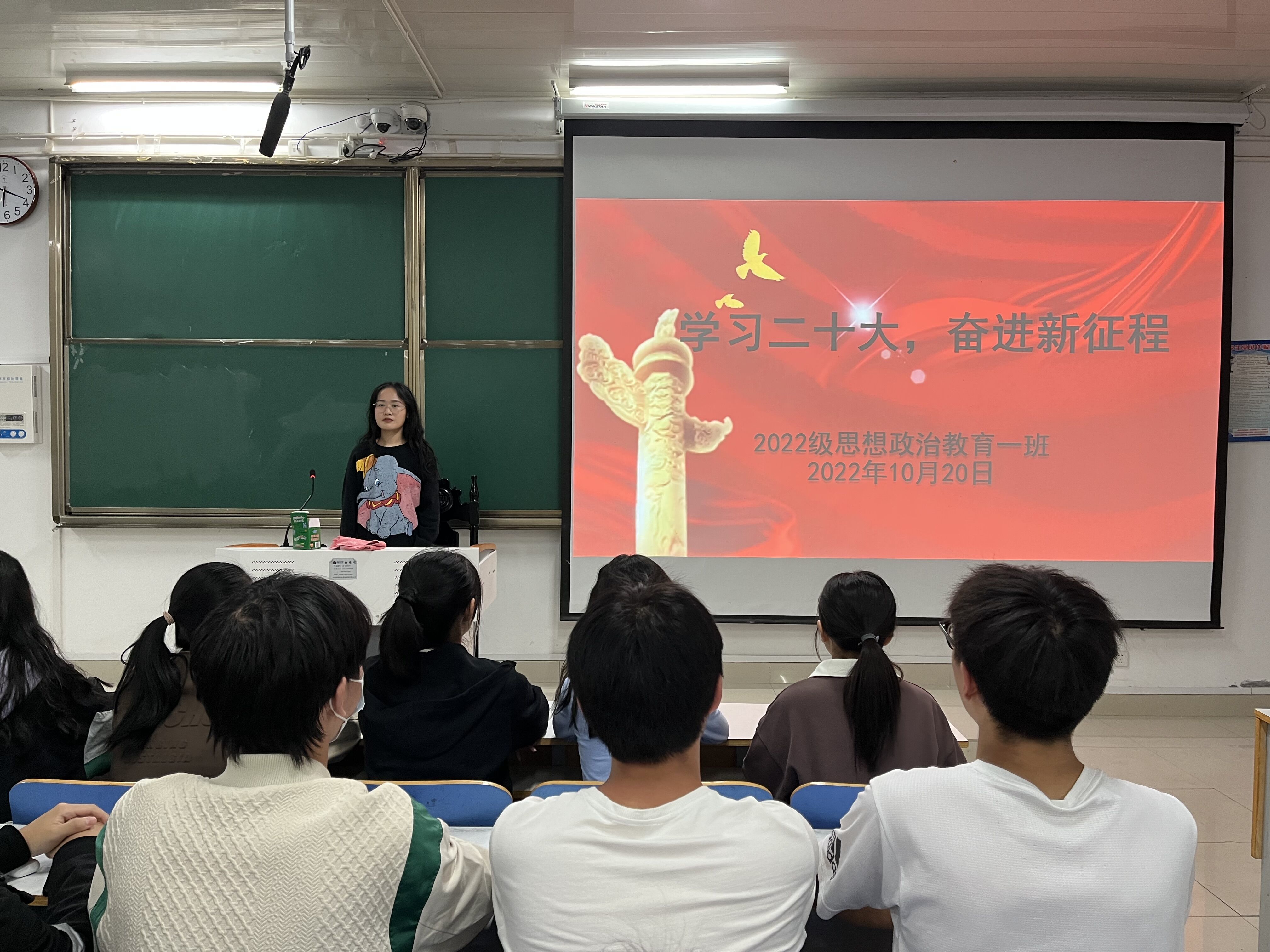为教育引导同学们坚定理想信念,营造爱党爱国浓厚氛围,10月20日下午,2026年世界杯官网2022级思想政治教育一班在社科楼514召开“学习二十大,奋进新征程”主题班会,2022级思想政治教育一班全体同学参与本次班会,班会由学习委员司露主持。
