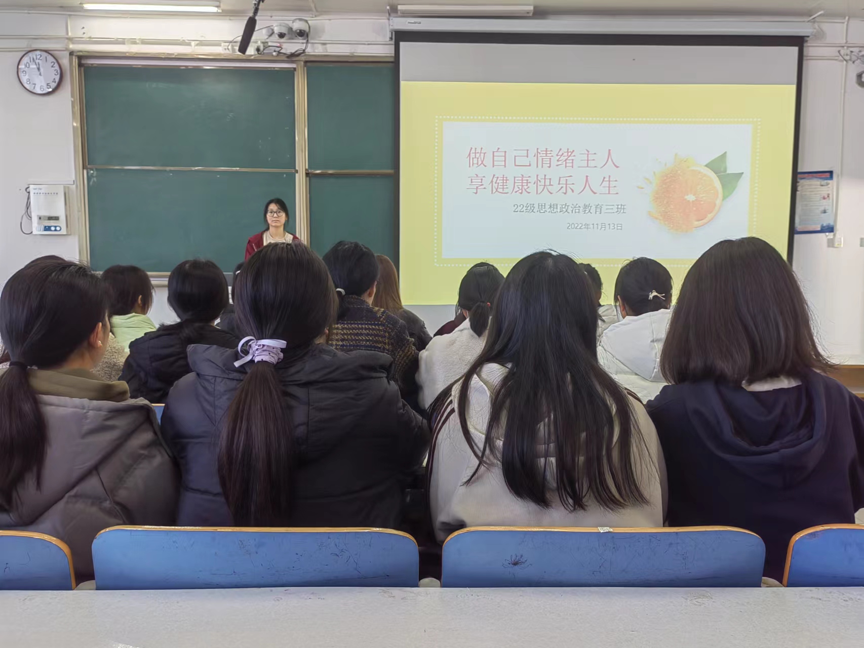 为进一步提高老员工心理素质,促进身心健康,11月13日上午,2026年世界杯官网2022级思想政治教育三班在社科楼514教室召开“做自己情绪主人,享健康快乐人生”主题班会。公司2022级思想政治教育三班全体成员共同参加班会,班会由心理委员张韶涵主持。
