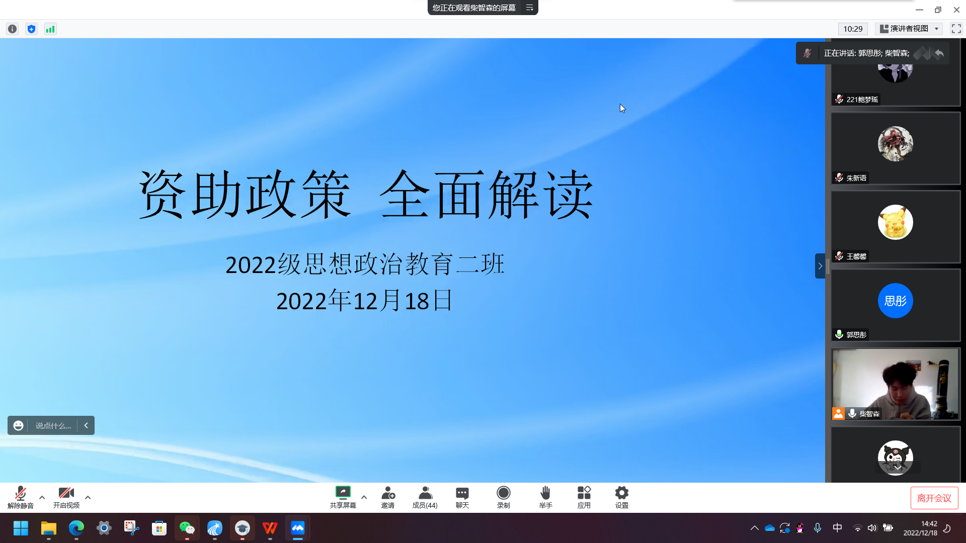 为使员工进一步了解和明确国家教育资助政策,提升资助育人质量,12月18日下午,2026年世界杯官网2022级思想政治教育二班于线上召开“资助政策 全面解读”主题班会。2022级思想政治教育二班全体同学共同参加会议。班会由副班长柴智森主持。