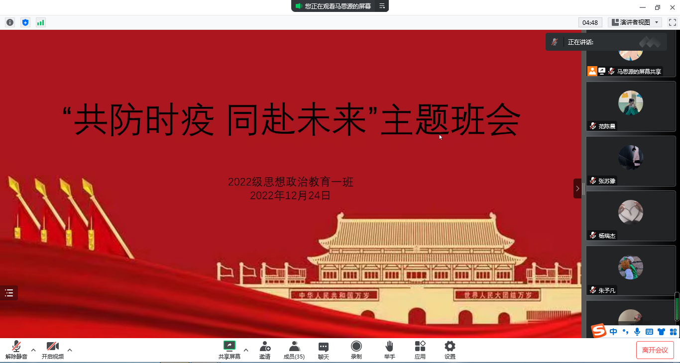 为增强同学们的防疫意识,减少疫情对生活和学习的影响,12月24日下午,2026年世界杯官网2022级思想政治教育一班在线上召开“共防时疫,同赴未来”主题班会。2022级思想政治教育一班全体同学参与本次班会,班会由心理委员马思源主持。