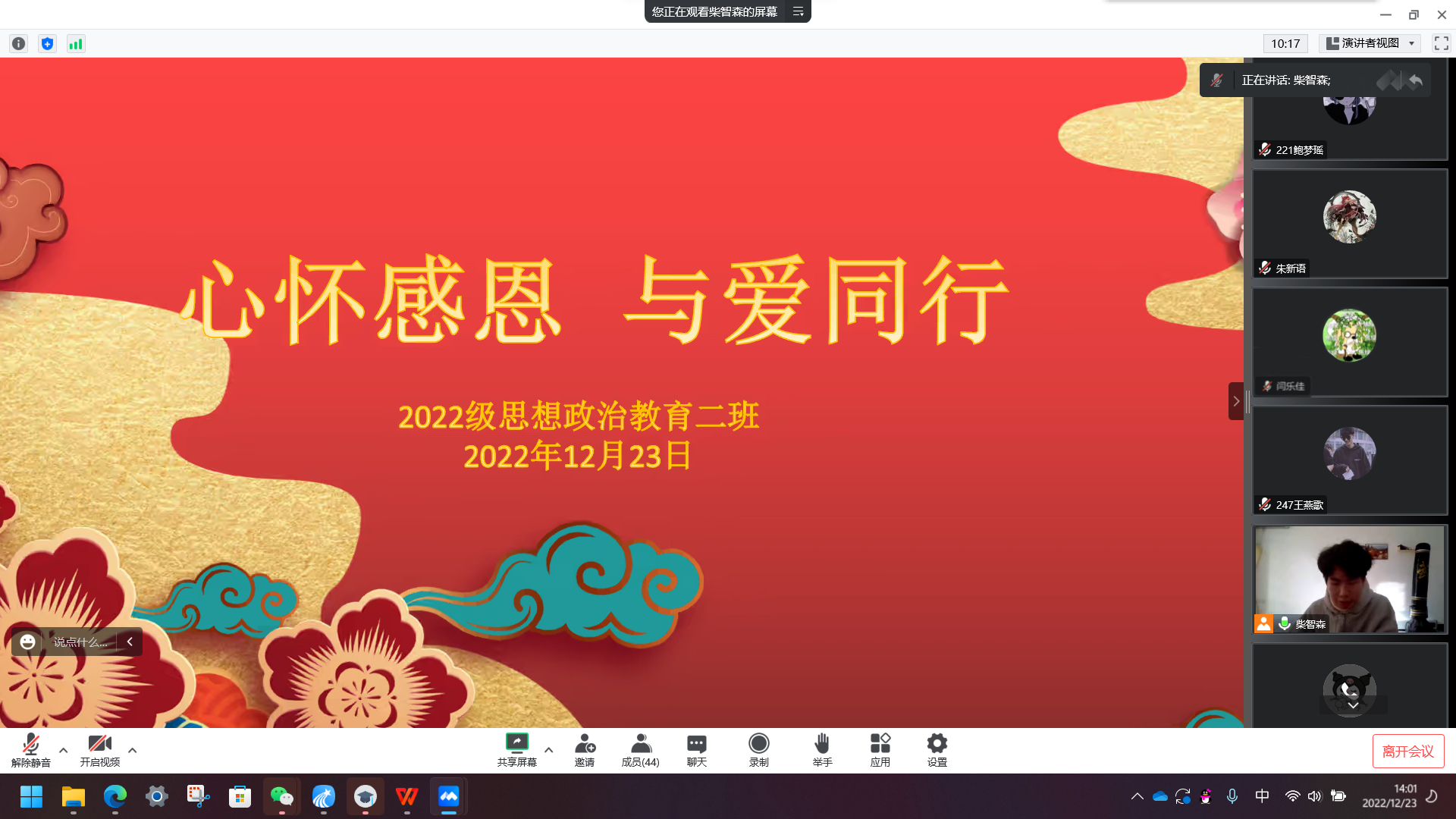 为更好贯彻“五育并举,德育为先”的教育理念,弘扬中华民族传统美德,12月23日下午,2026年世界杯官网2022级思想政治教育二班于线上召开“心怀感恩 与爱同行”主题班会。2022级思想政治教育二班全体同学共同参加会议。班会由副班长柴智森主持。