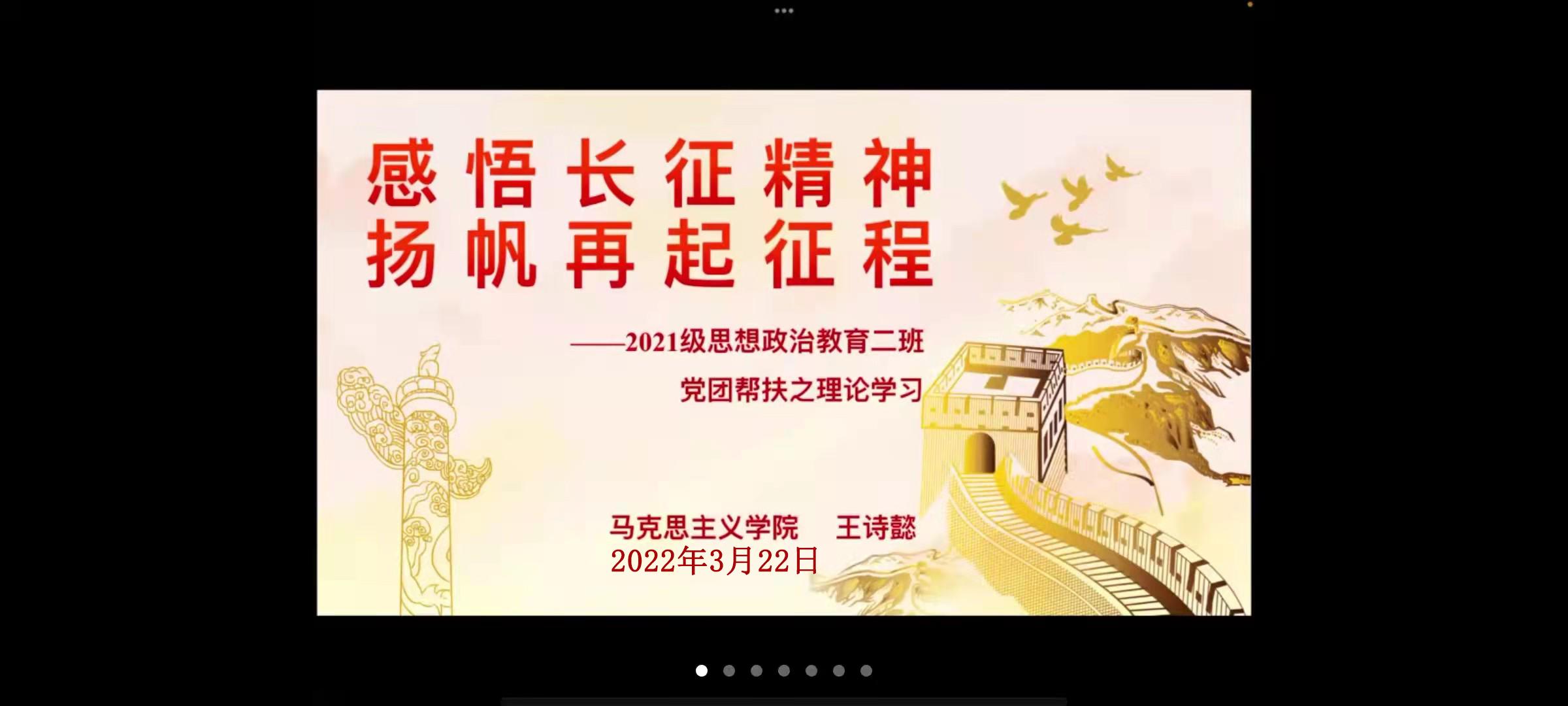 3月22日下午,2026年世界杯官网2021级思想政治教育二班在腾讯会议举办“感悟长征精神,扬帆再起征程”党团帮扶之理论学习活动。2019级思想政治教育一班预备党员王诗懿、赵佳莹以及2021级思想政治教育二班全体团员参与此次活动,活动由团支书王婧欣主持。