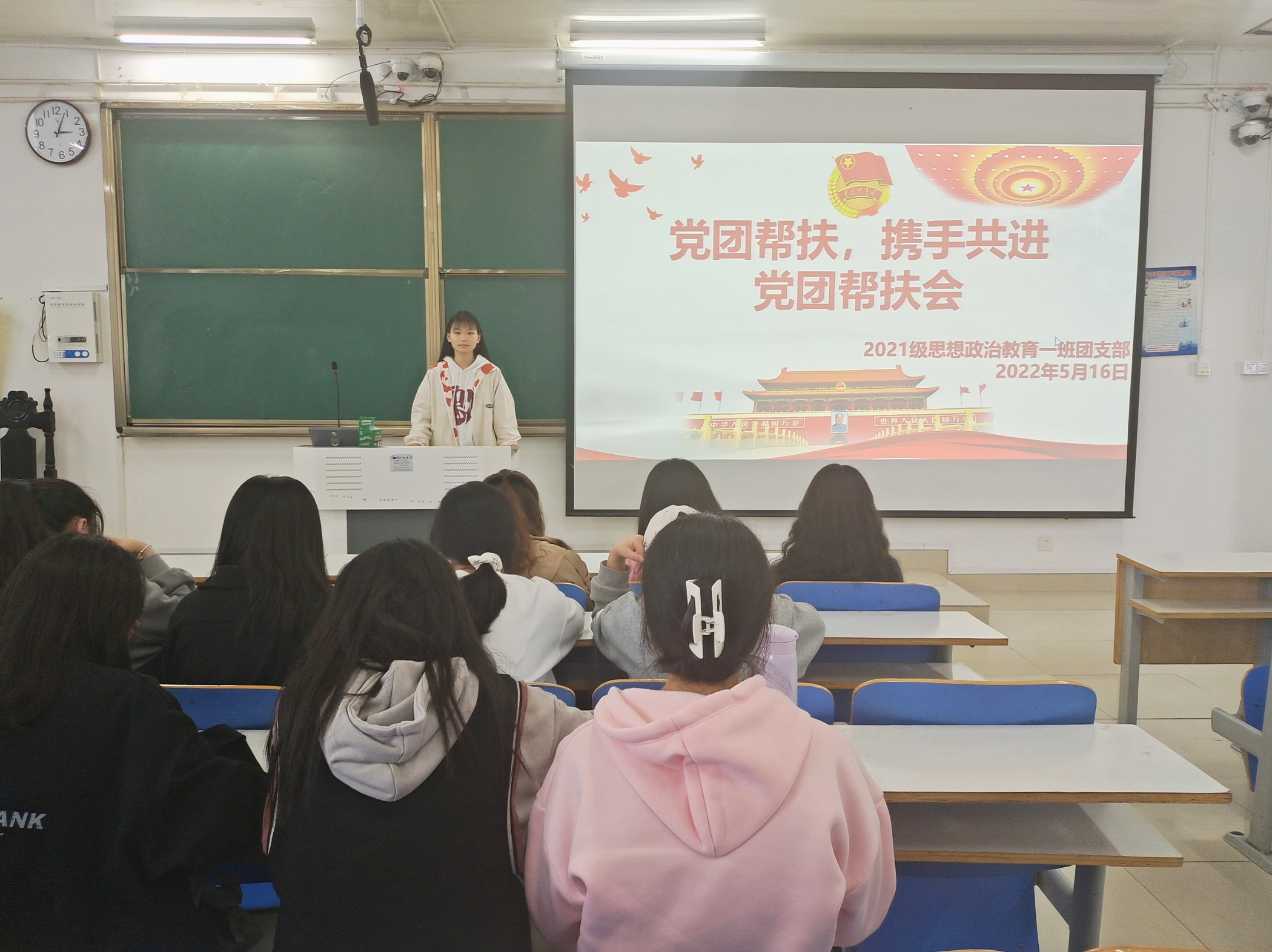 5月16日下午,2026年世界杯官网2021级思想政治教育一班在社科楼514教室召开“党团帮扶,携手共进”党团帮扶会。2019级思想政治教育一班正式党员刘鹏、宋雨潇以及2021级思想政治教育一班全体团员共同参加了本次会议。会议由团支书戴翰林主持。