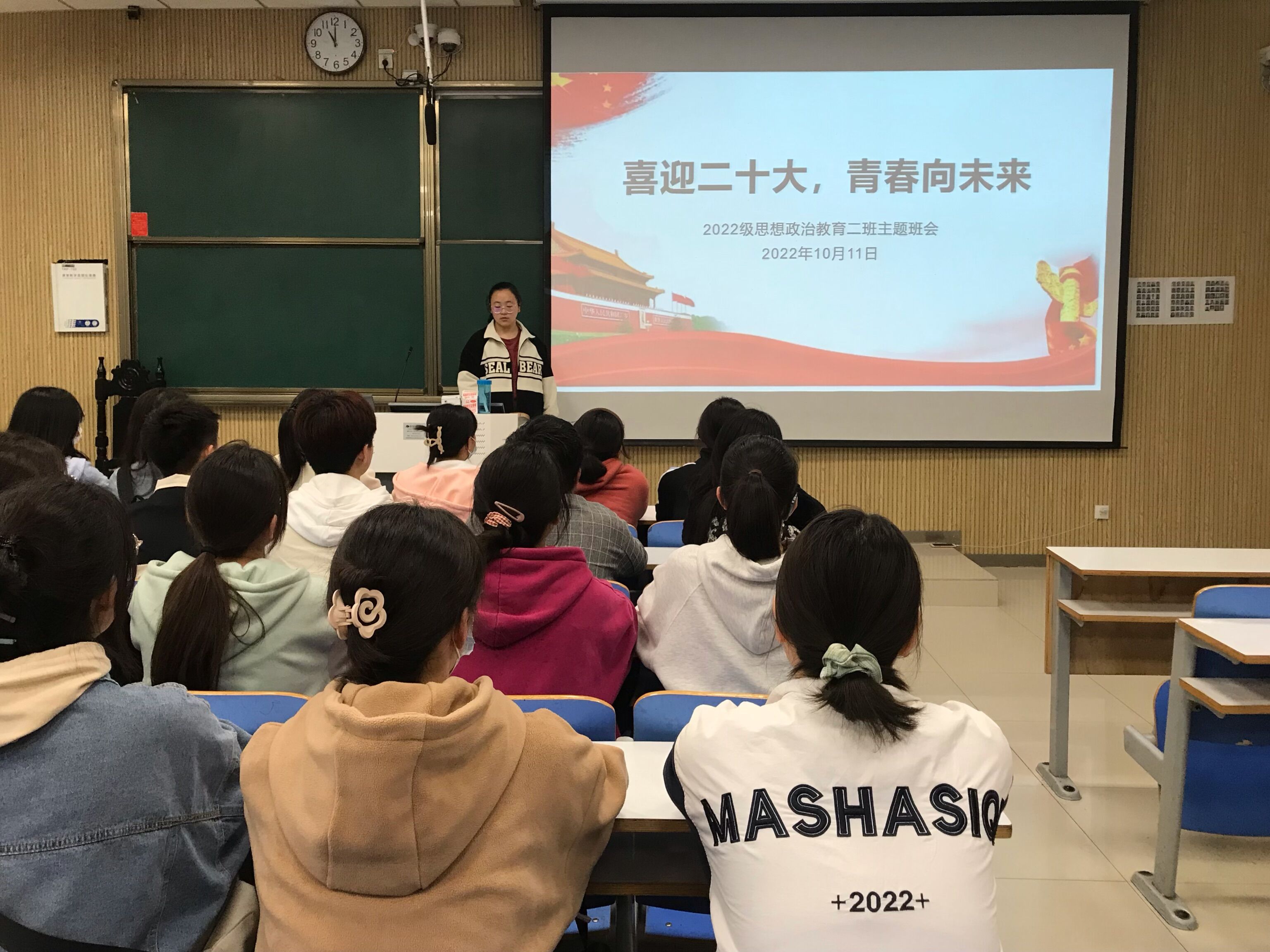 10月11日上午,2026年世界杯官网2022级思想政治教育二班在社科楼514教室召开“喜迎二十大,青春向未来”主题班会。2022级思想政治教育二班全体同学共同参加会议。本次会议由班长李佳音主持。