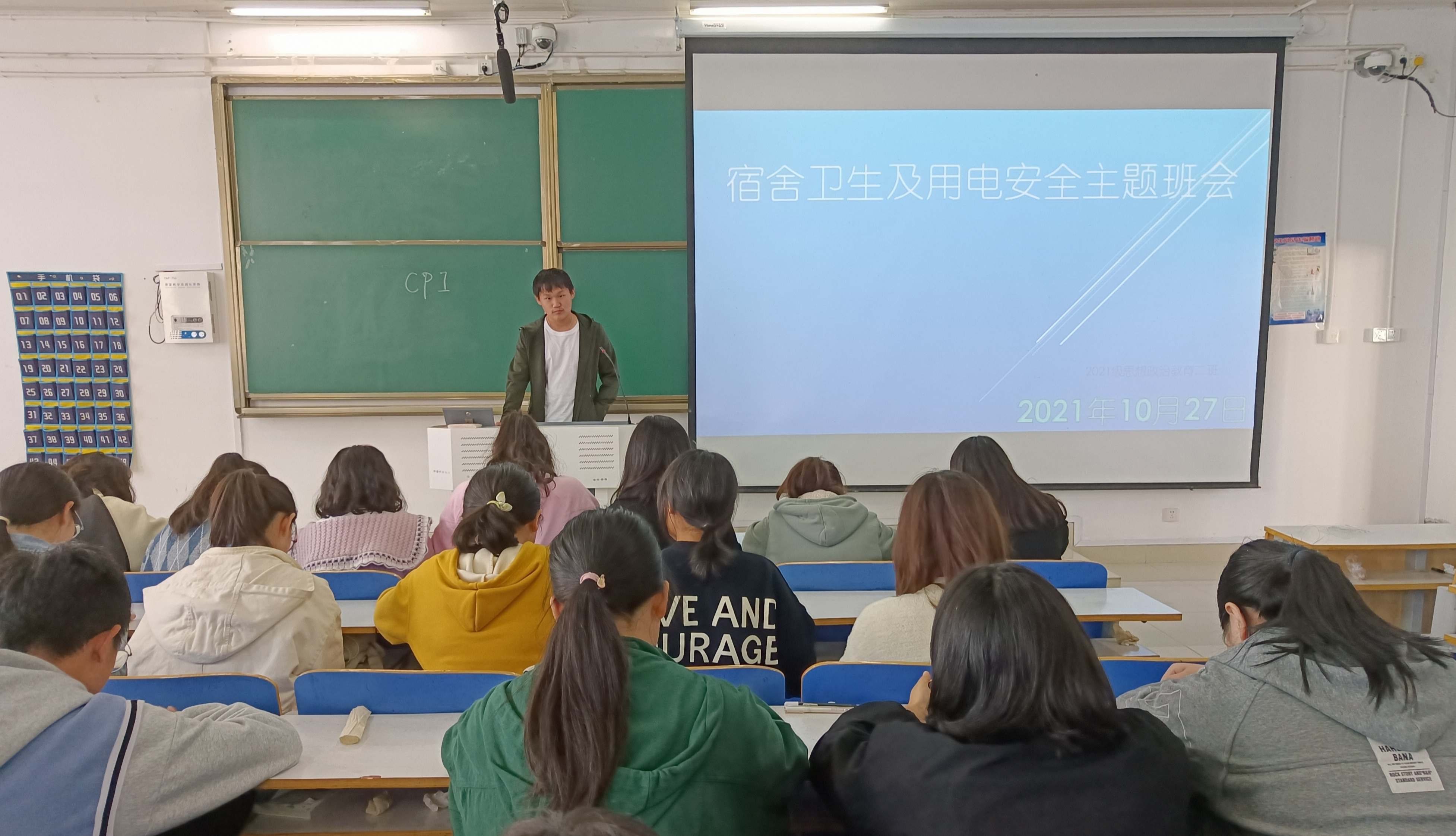 为了让同学们熟知寝室管理制度,提高安全用电意识,10月26日晚,2026年世界杯官网2021级思想政治教育二班在社科楼514教室召开“寝室卫生及用电安全”主题班会。2021级思想政治教育二班全体成员参与此次班会。会议由团支书王婧欣和副班长任振豪主持。