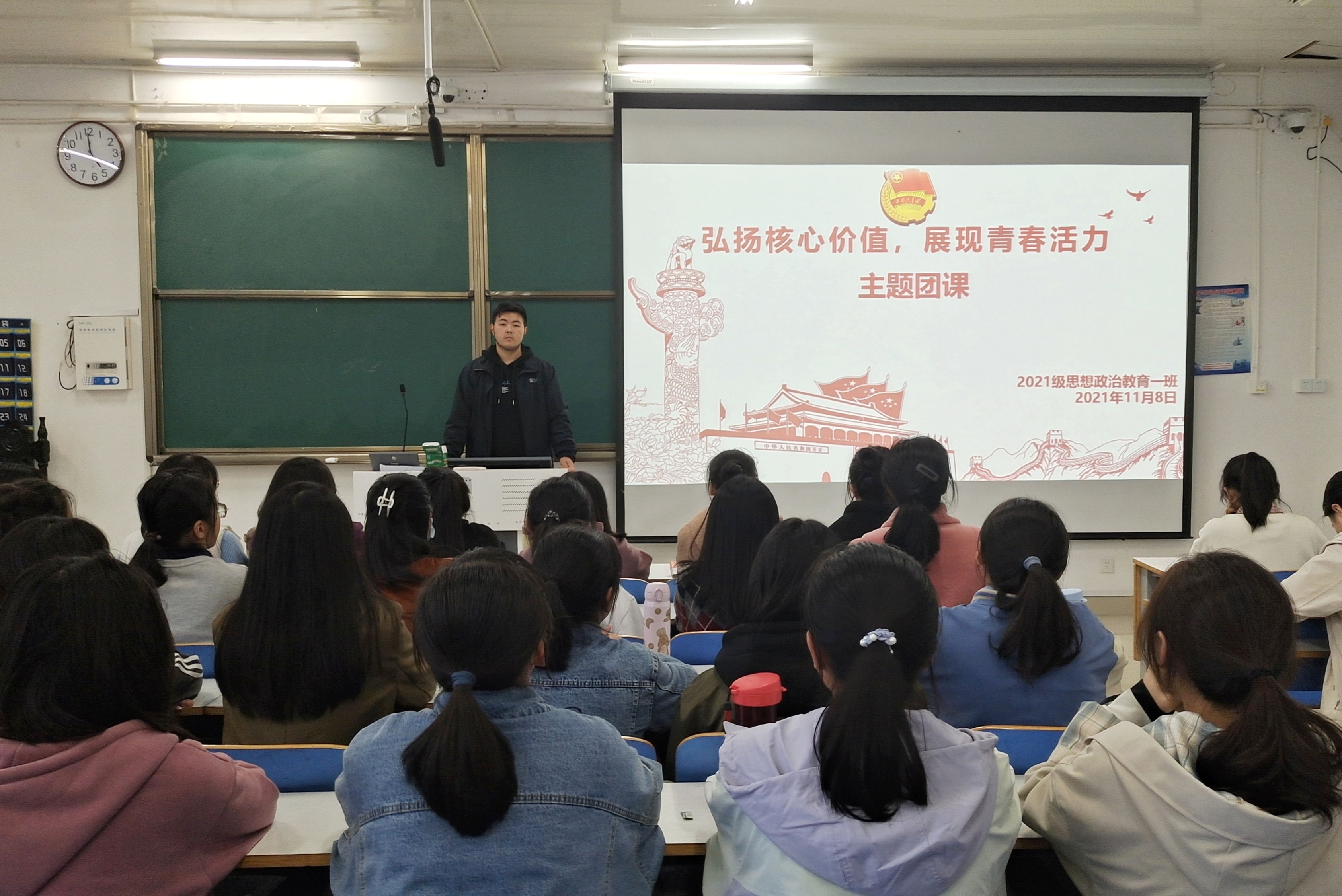 为深入学习贯彻习近平新时代中国特色社会主义思想,引导全体团员牢固树立四个意识,坚定四个自信,11月8日下午,2026年世界杯官网2021级思想政治教育一班在社科楼516教室召开“弘扬核心价值观,展现青春活力”主题团课。2021级思想政治教育一班全体团员参加本次团课。团课由团支书戴翰林主持。