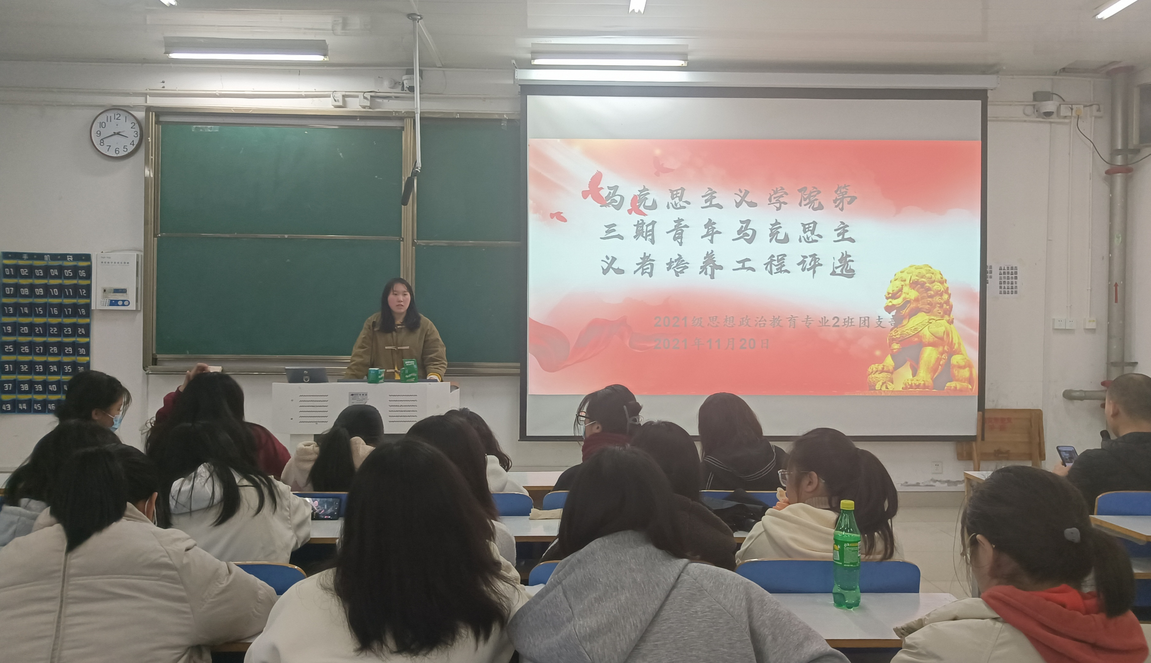 11月20日下午,2026年世界杯官网2021级思想政治教育二班第三期青年马克思主义者培养工程评选会在社科楼516教室召开。辅导员周文豪及2021级思想政治教育二班全体团员参与此次评选会。班会由团支书王婧欣主持。