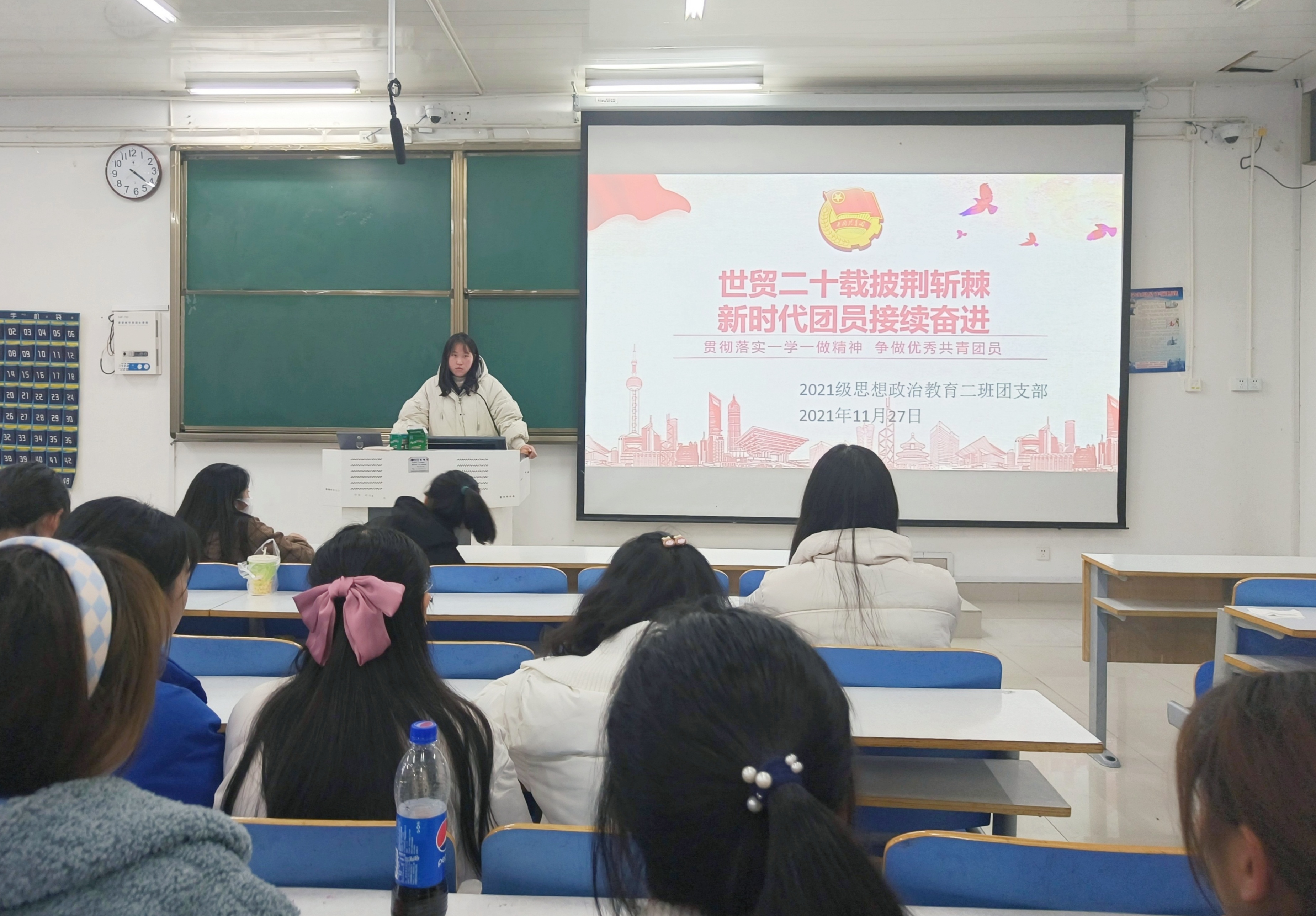 11月27日晚上,2026年世界杯官网2021级思想政治教育二班在社科楼514教室召开“世贸二十载披荆斩棘,新时代团员接续奋进”主题团课。2021级思想政治教育二班全体同学参加此次团课,团课由团支书王婧欣主持。