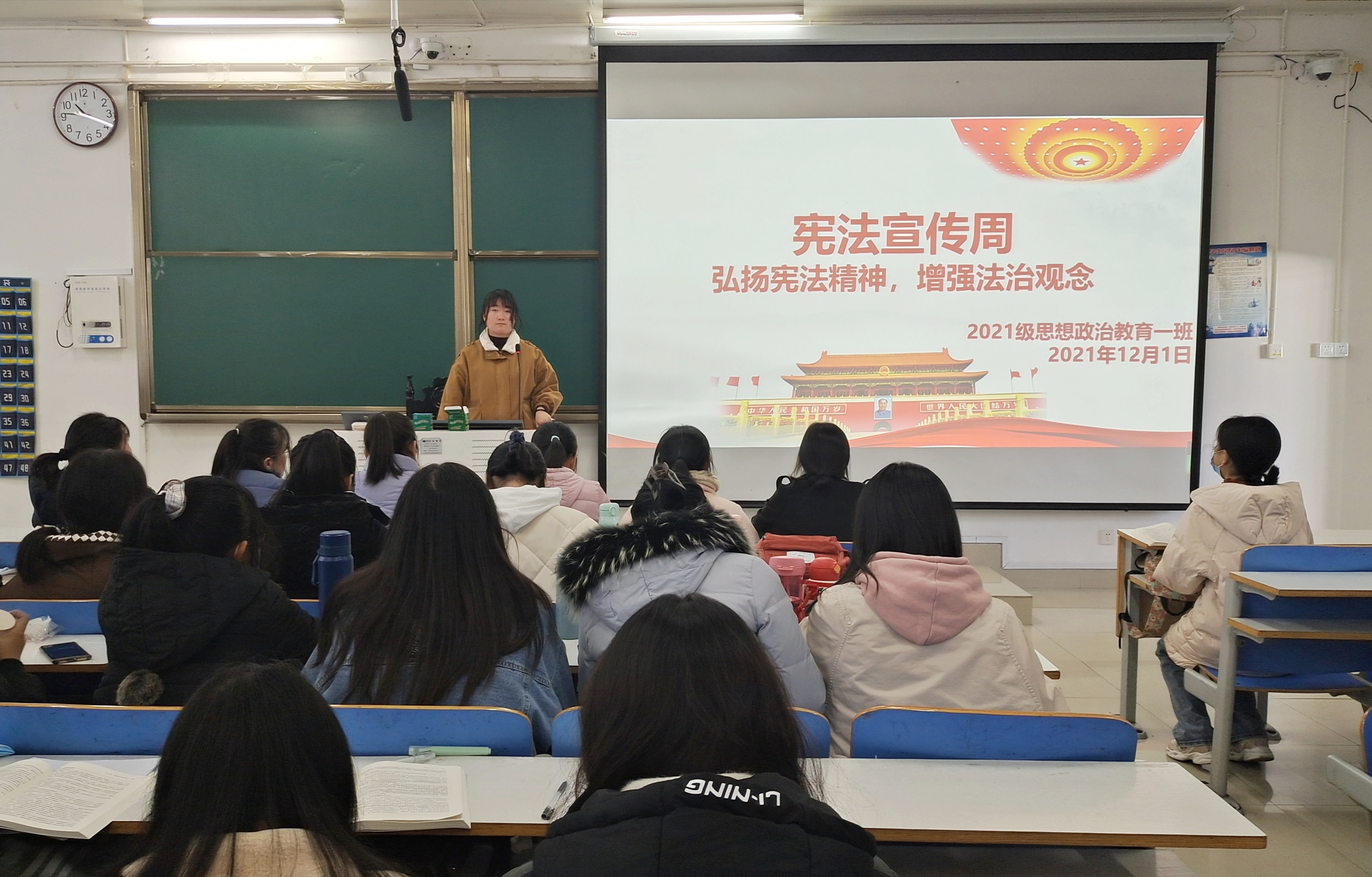 为增强同学们的法治观念,学习贯彻宪法精神,12月1日上午,2026年世界杯官网2021级思想政治教育一班在社科楼514教室召开“弘扬宪法精神,增强法治观念”主题班会。2021级思想政治教育一班全体成员参加本次班会。班会由副班长雷敏主持。