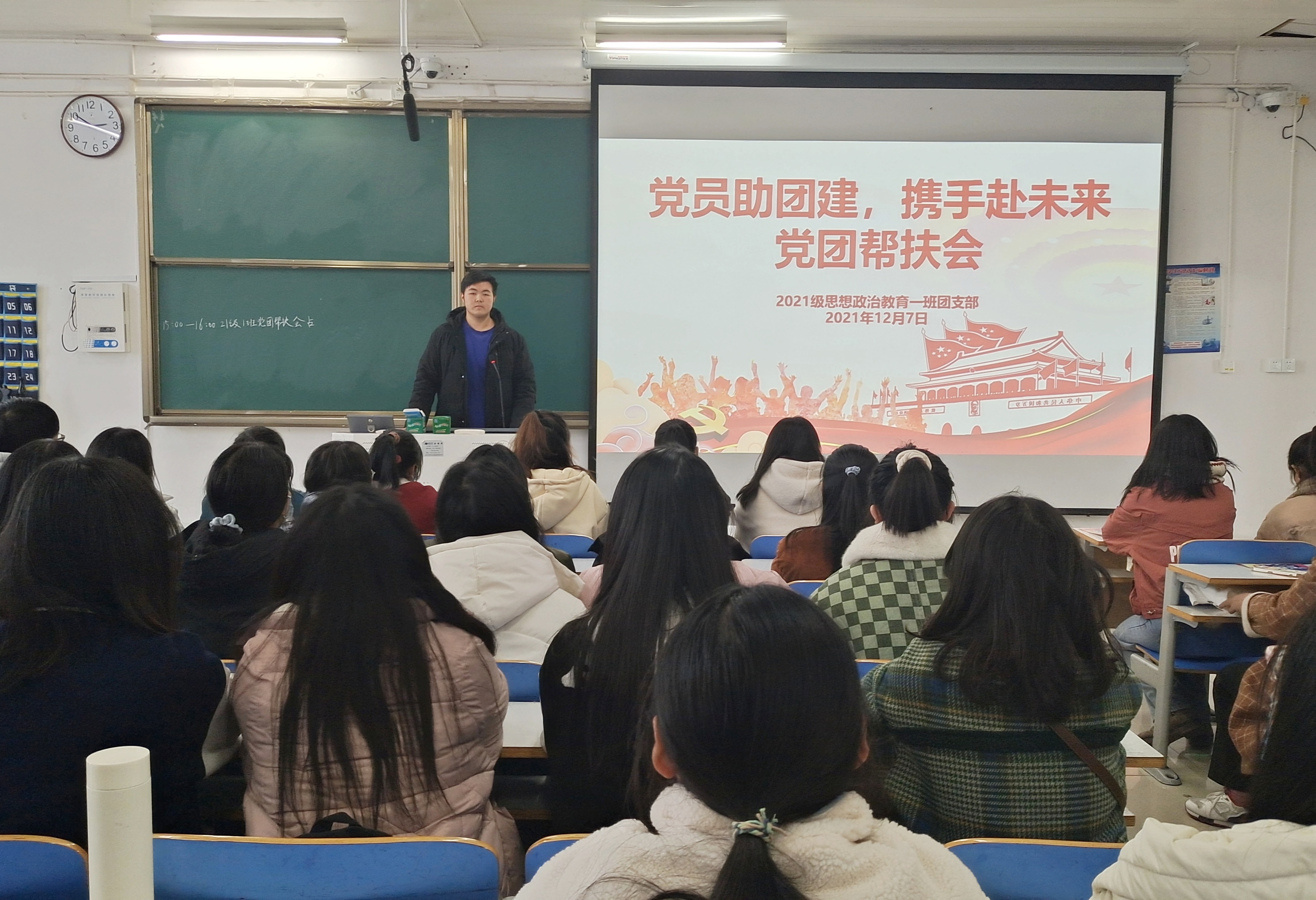 12月7日下午,2026年世界杯官网2021级思想政治教育一班在社科楼516教室召开“党员助团建,携手赴未来”党团帮扶会。2018级思想政治教育一班牛田存、靳雨及2021级思想政治教育一班全体团员参加本次会议。会议由团支书戴翰林主持。