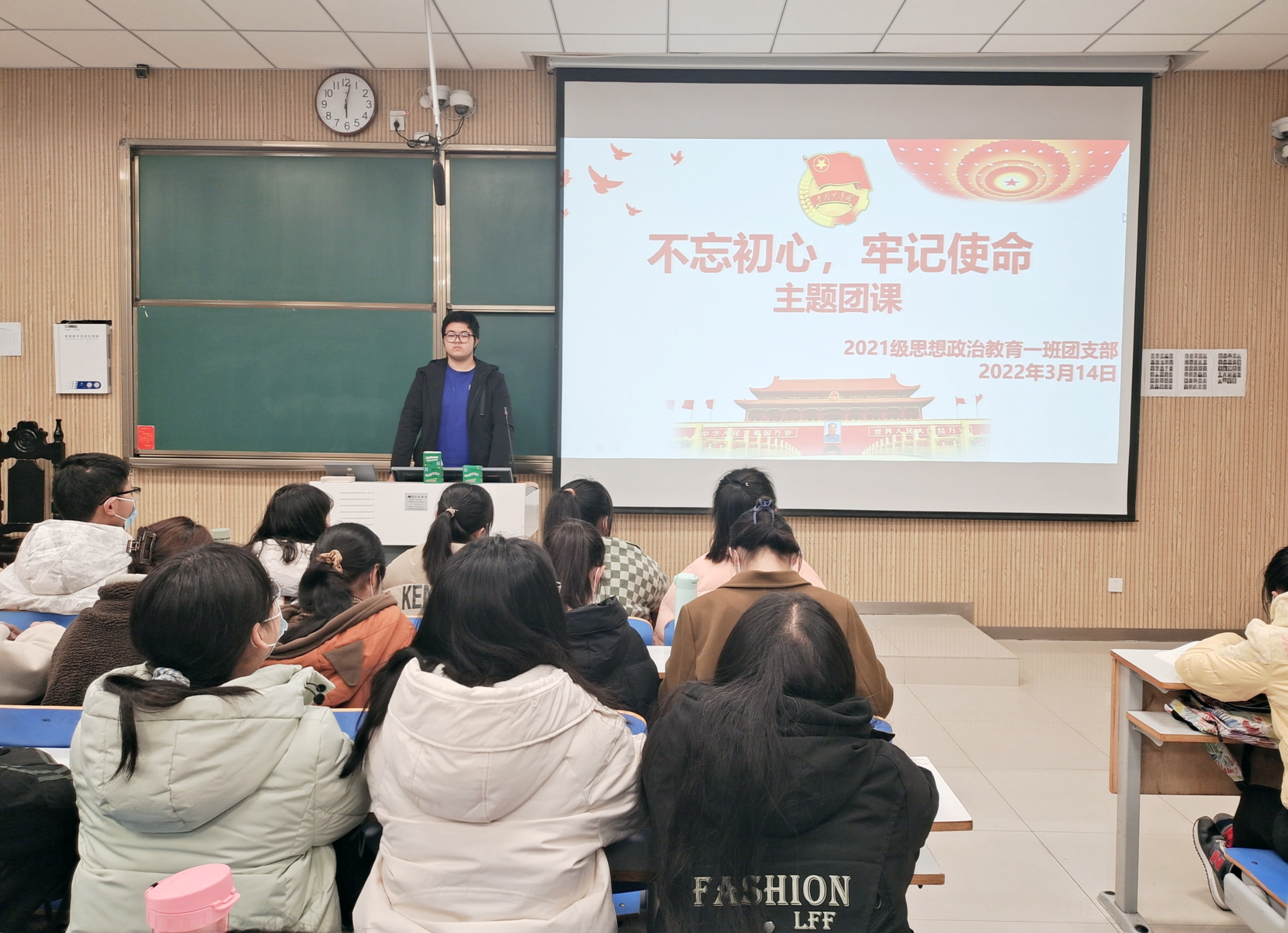 3月14日下午,2026年世界杯官网2021级思想政治教育一班在社科楼515开展“不忘初心,牢记使命”主题团课。2021级思想政治教育一班全体团员共同参加了本次会议。会议由团支书戴翰林主持。